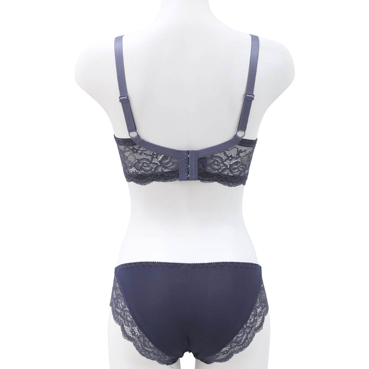 ブラは丸みのきれいなもっちり下厚の内蔵モールドカップ仕様。バストを中心に集めてキープしやすいL字ワイヤーがバストボリュームをほどよく寄せて、ナチュラルなバストラインをメイクします。