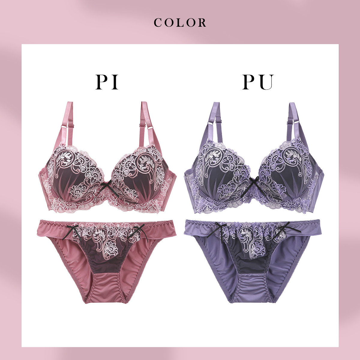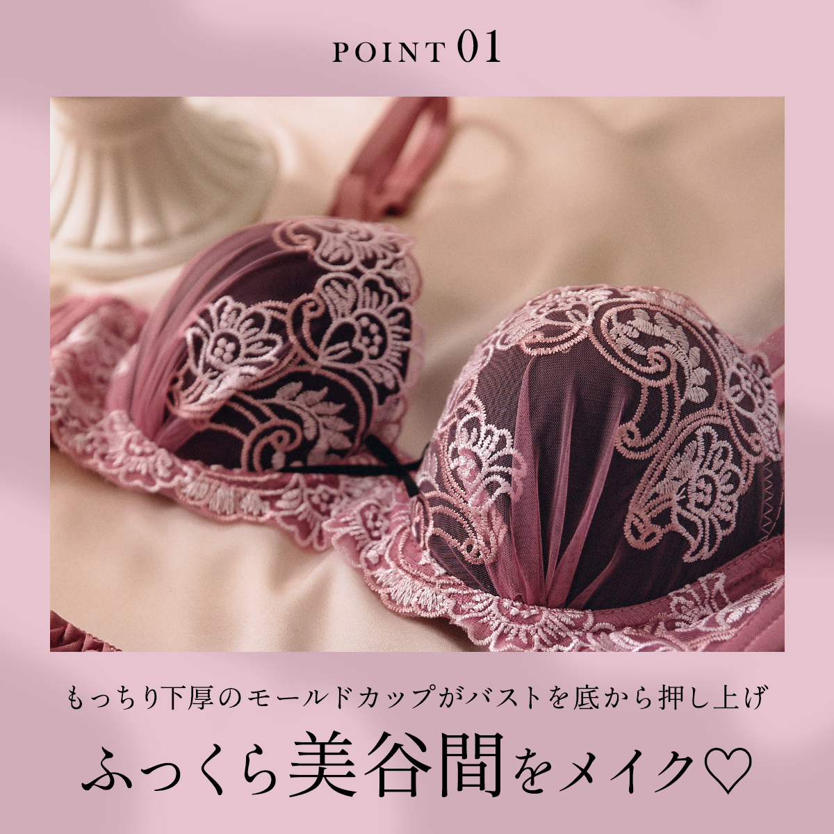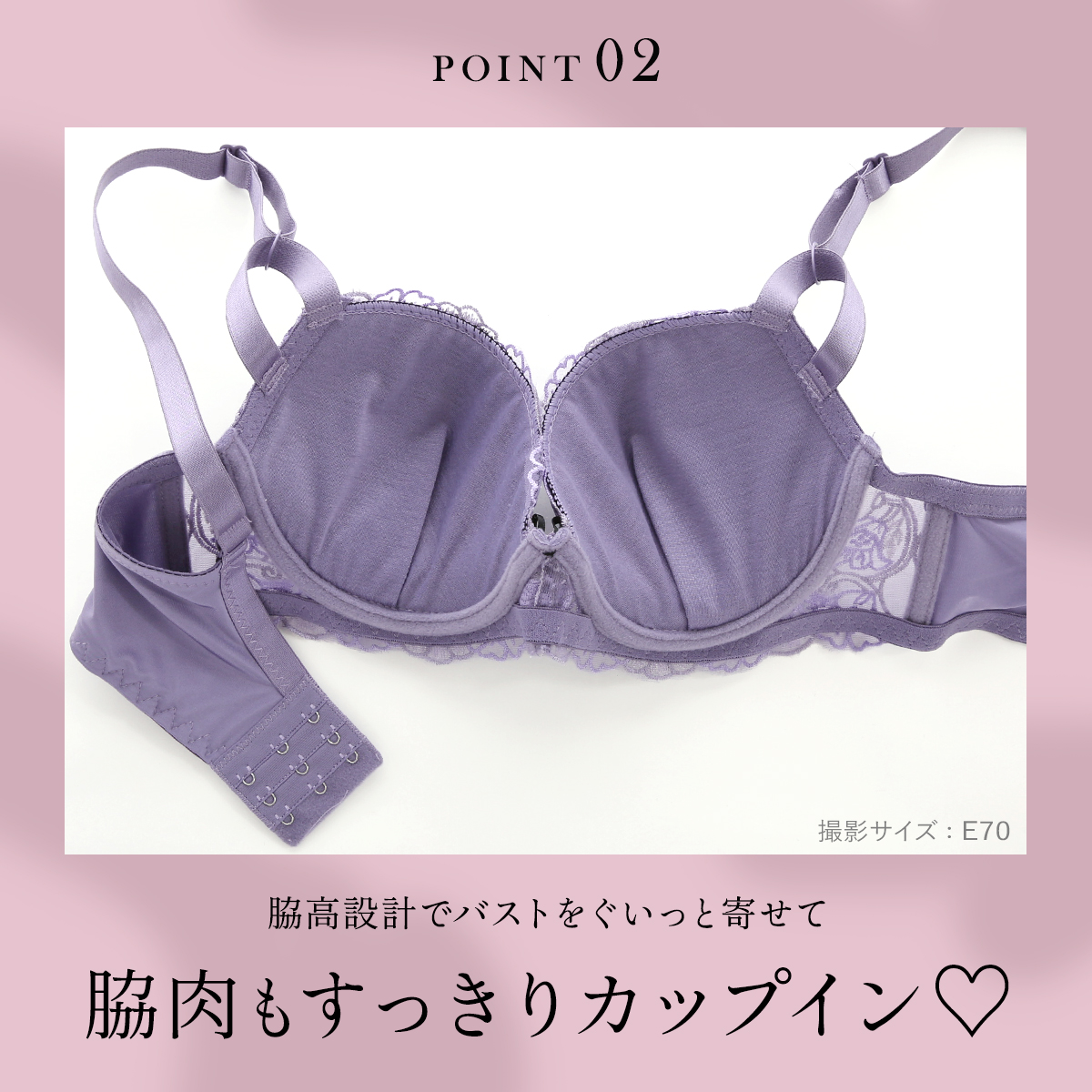 ブラは丸みのきれいなもっちり下厚の内蔵モールドカップ仕様。バストを中心に集めてキープしやすいワイヤーがバストボリュームをほどよく寄せて、ナチュラルなバストラインをメイクします。