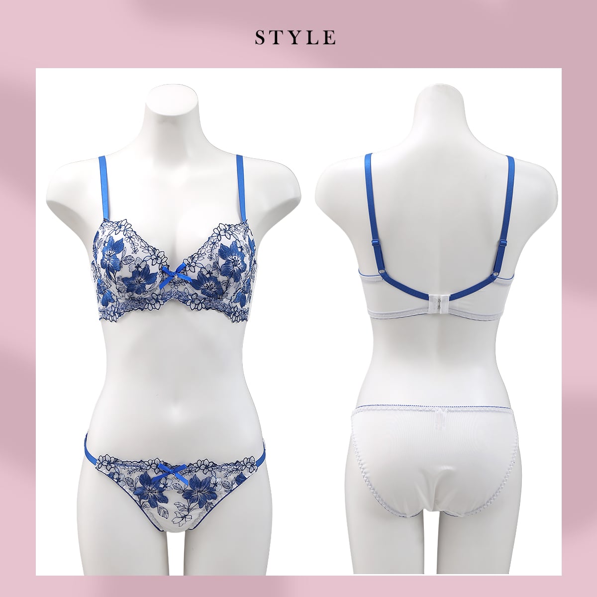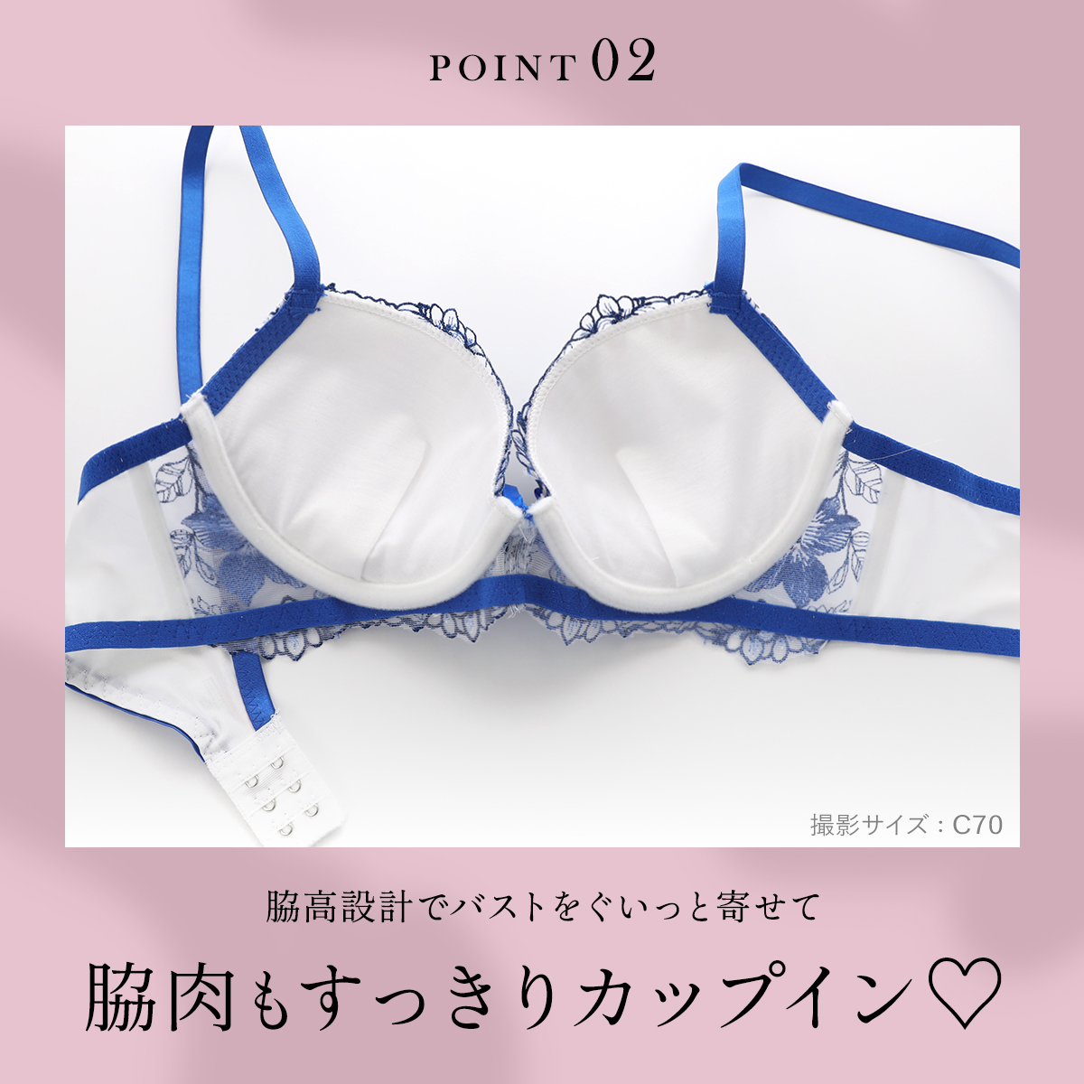 | 仕 様 | ブラ ・脇高設計 ・3/4カップ ・ホックの数:2段3列 ・下厚内蔵パッドあり、パッドポケットなし ・肩紐取外し:不可 ・ワイヤー入り ・サイドボーン:あり