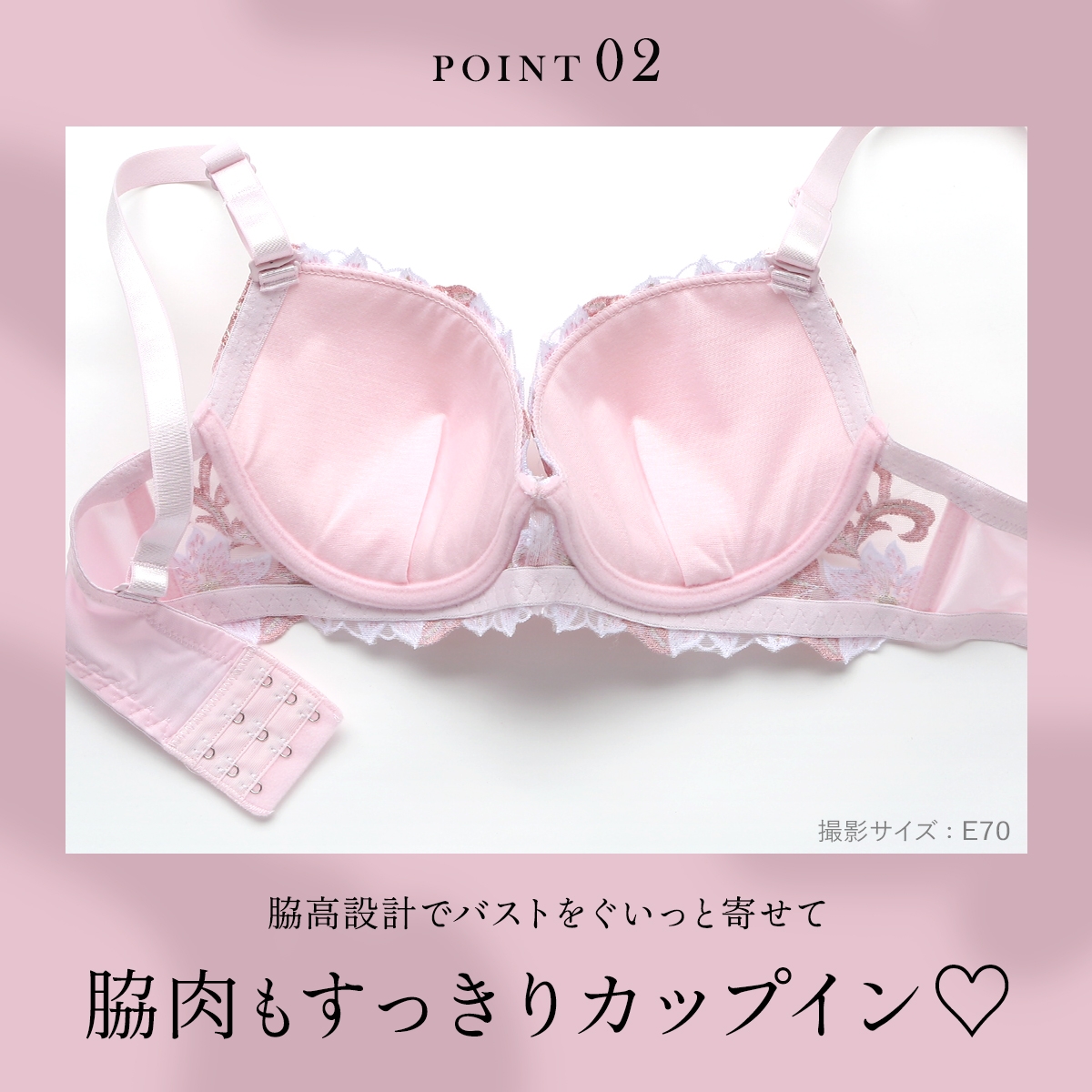 脇高設計で気になる脇肉もしっかりキャッチ。カップ脇は伸びない素材の裏打ちとサイドボーンで、着装時の安定感を高めています。