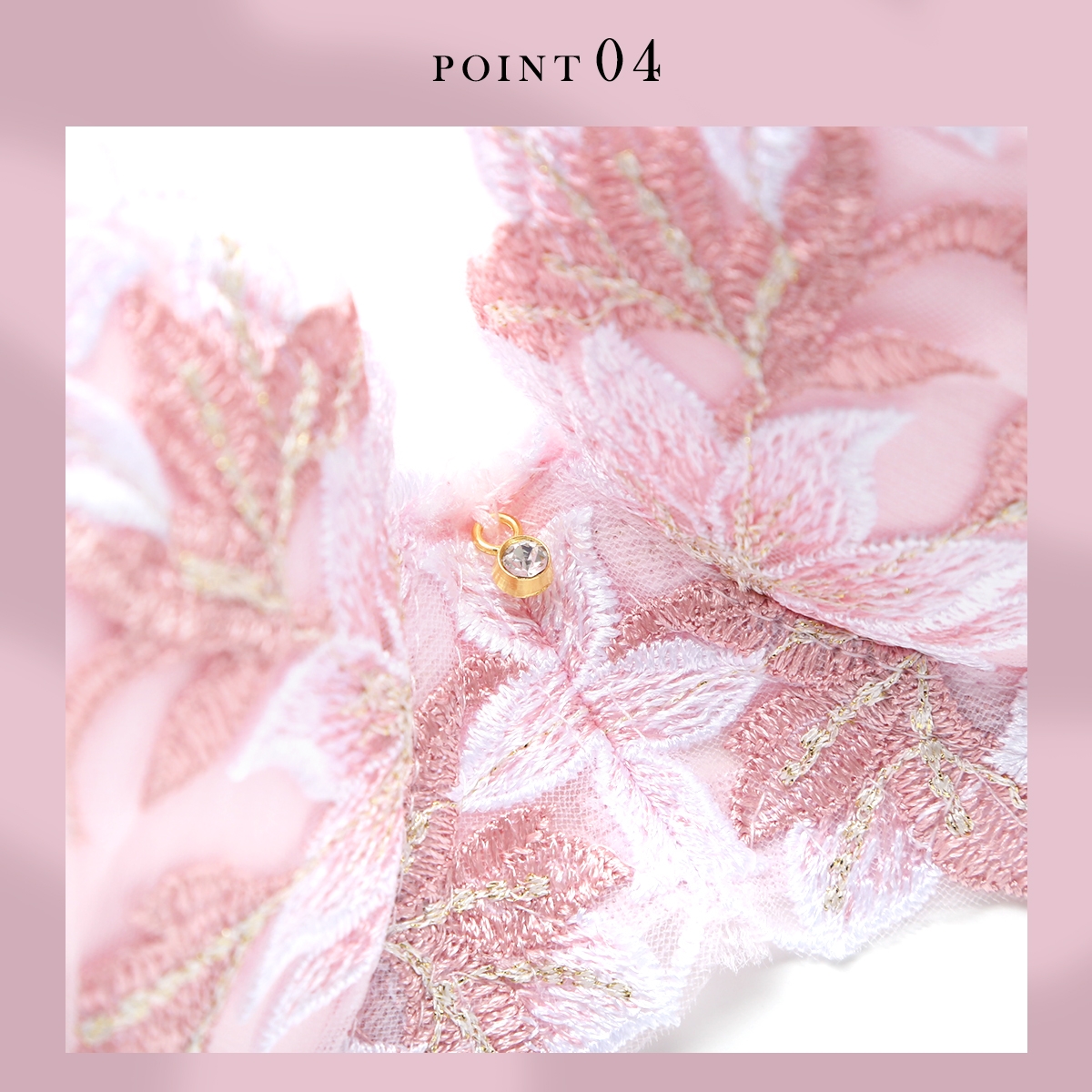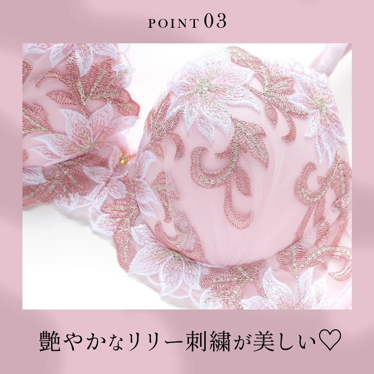 ブラは丸みのきれいなもっちり下厚の内蔵モールドカップ仕様。バストをほどよく寄せて下から持ち上げるU字ワイヤーが、バストトップの位置を高くキープし、デコルテにふっくら感のある美胸シルエットをメイクします。