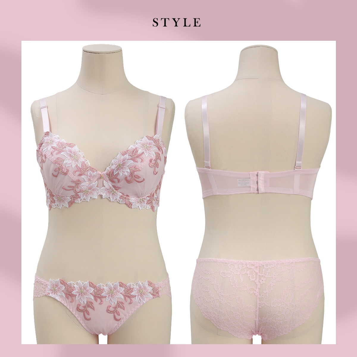 ショーツはバックレースで華やかに仕上げた別注デザイン。華奢なウエストデザインが女性らしさを引き立てます。