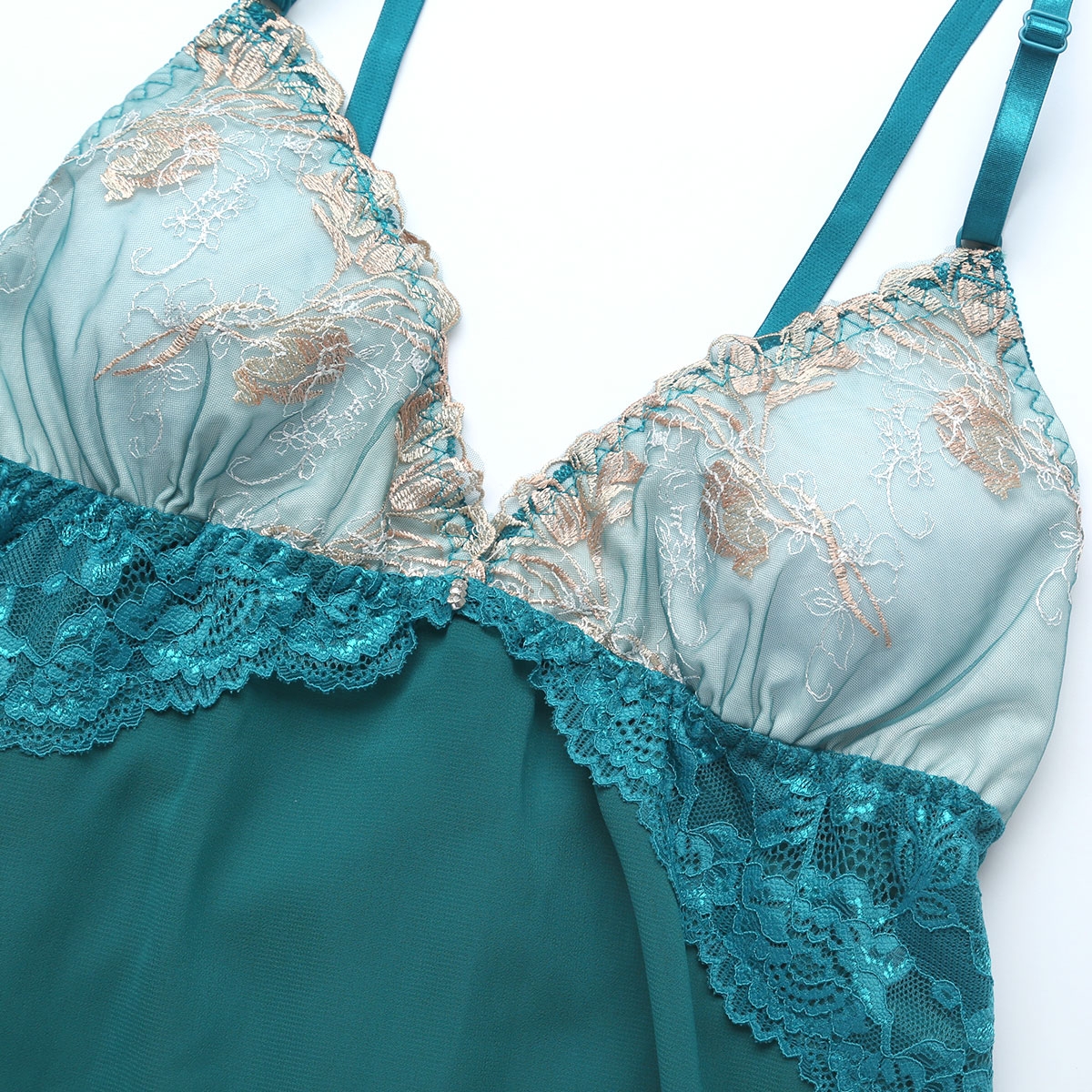 ラメの煌めきを湛えた瑞々しいフラワー刺繍が印象的な、スリップとショーツのセット。チュールの透け感が軽やかなで、刺繍の美しさを引き立てています。