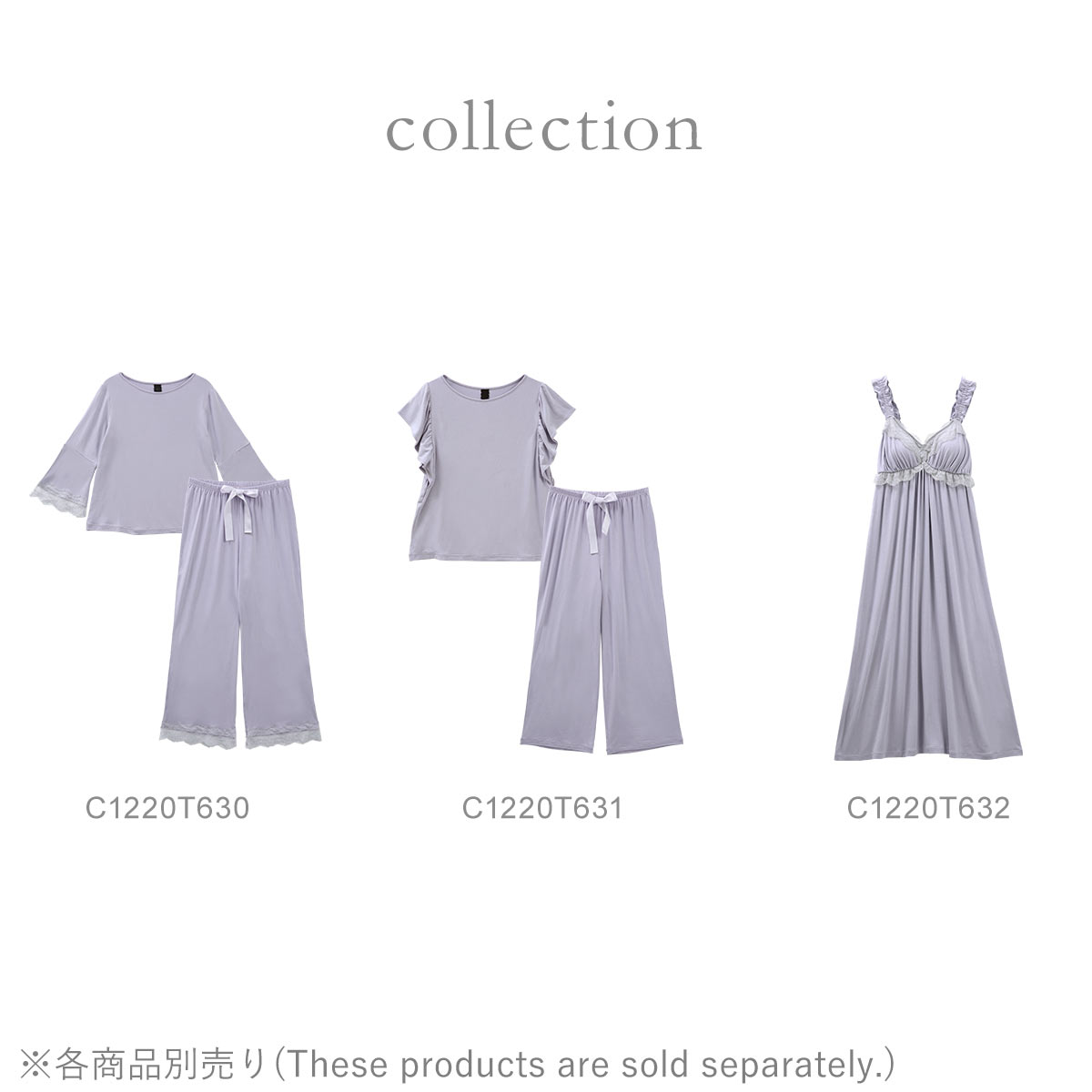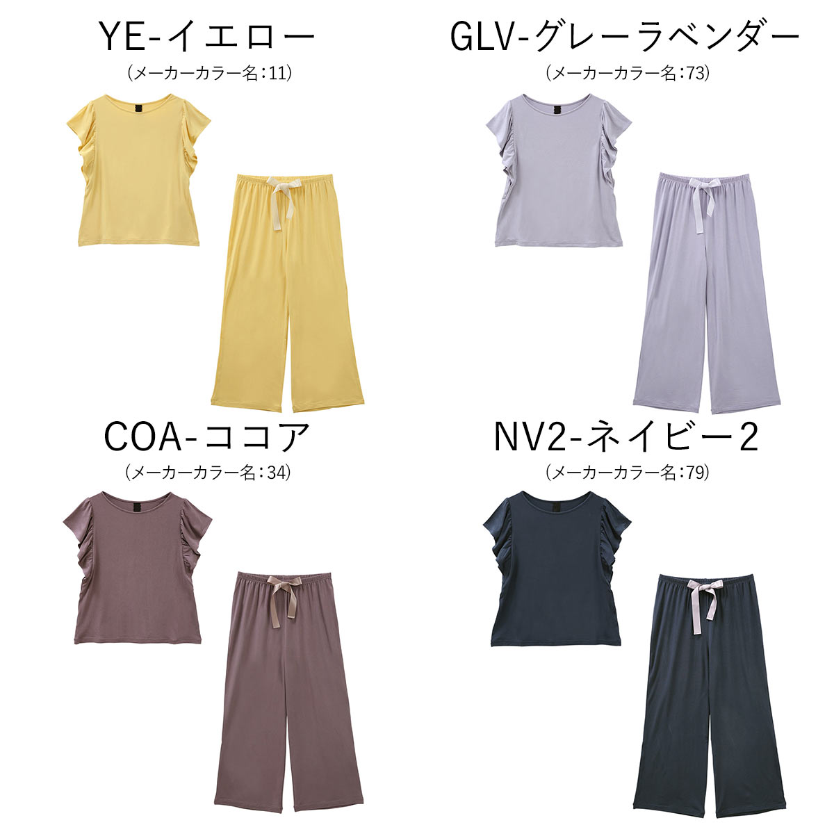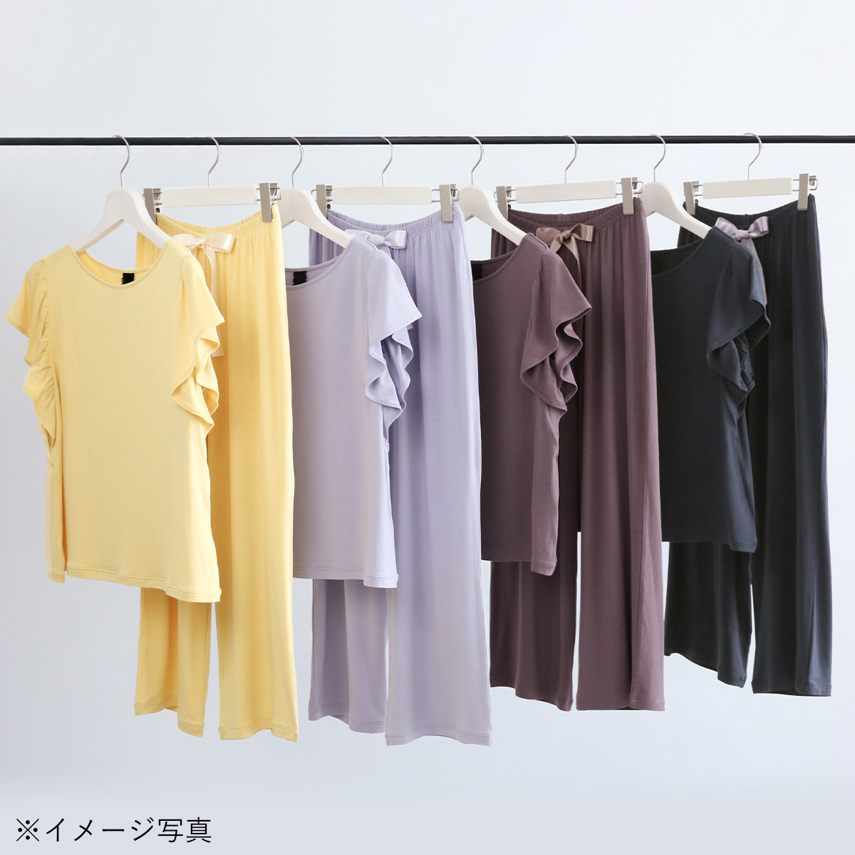 やわらかくストレッチ性のあるとろみ素材がリラクシーな着心地の「ゆるっととろみタッチ」シリーズ。ラッフルスリーブ&ワイドパンツセットです。