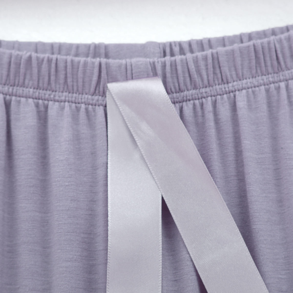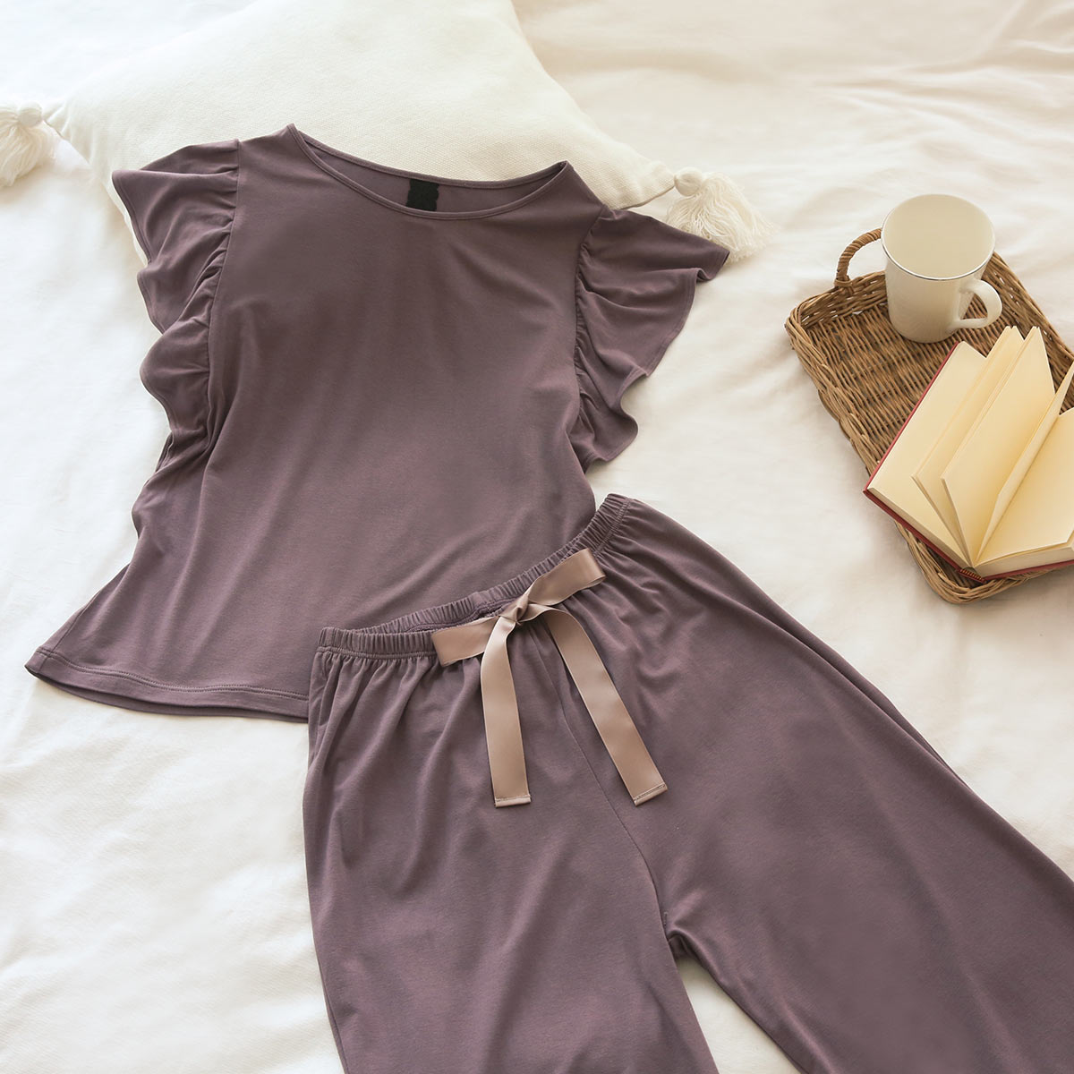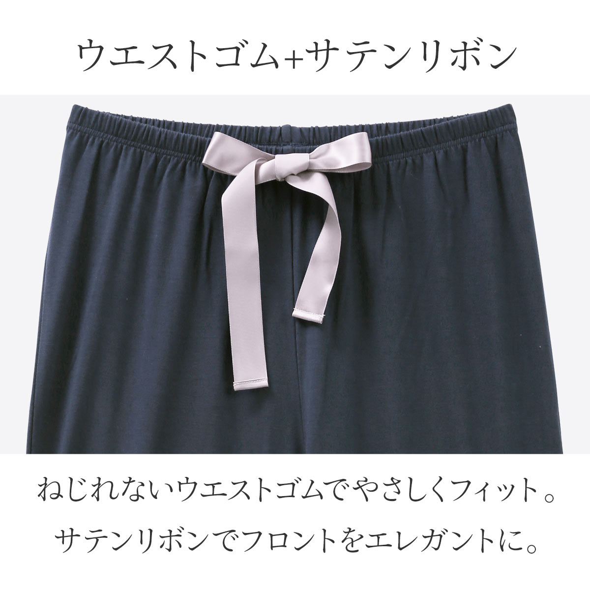トップスは肩にギャザーを入れ、ふわりと波立つエレガントなドレープのラッフルスリーブに仕上げました。パンツのウエストゴムはねじれにくい縫製で着脱しやすくストレスフリー。フロントの飾りサテンリボンがアクセントを添えます。