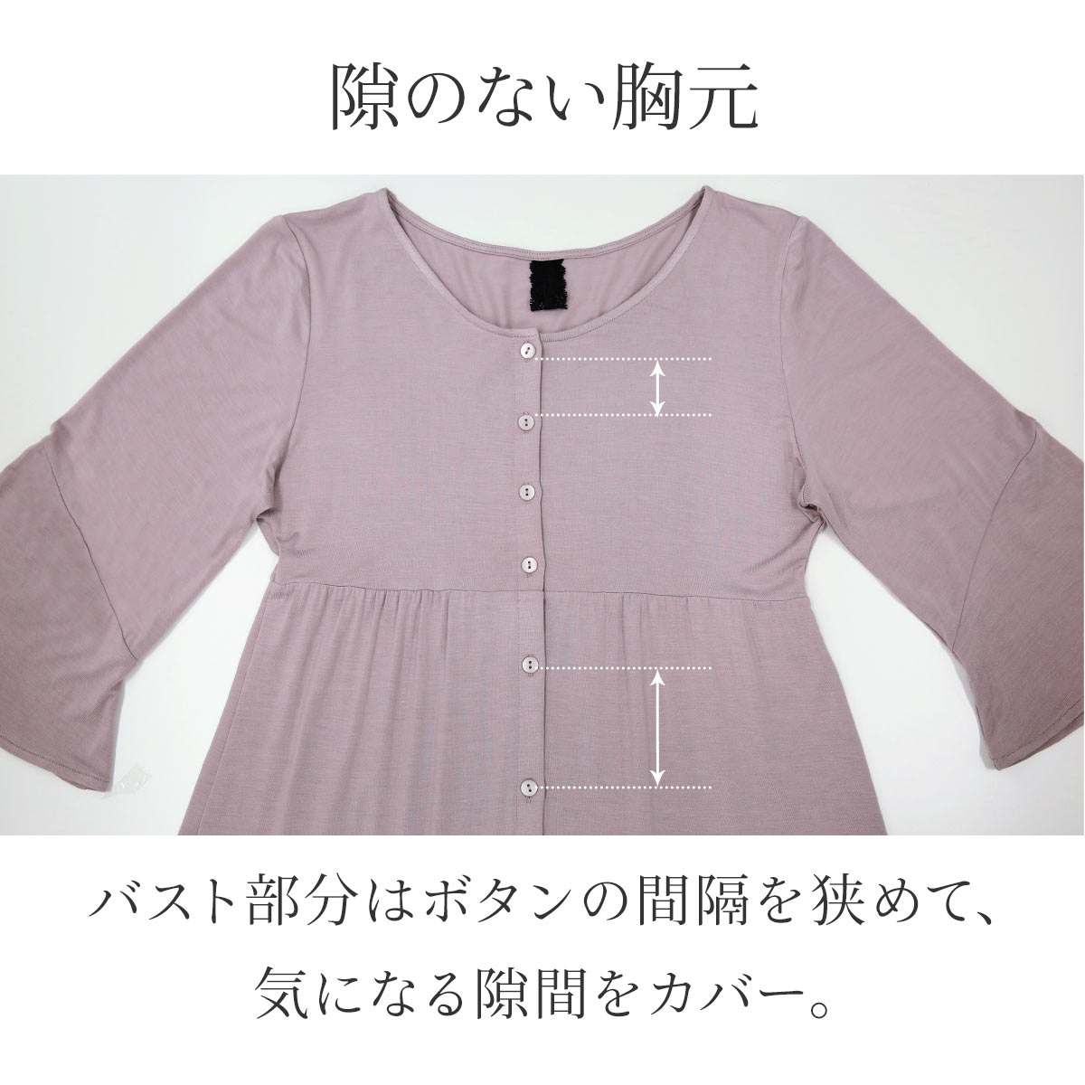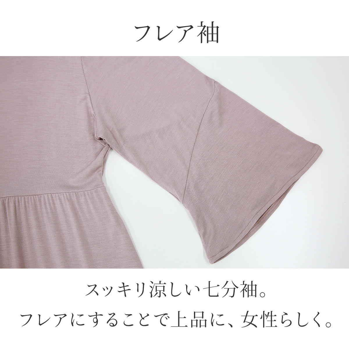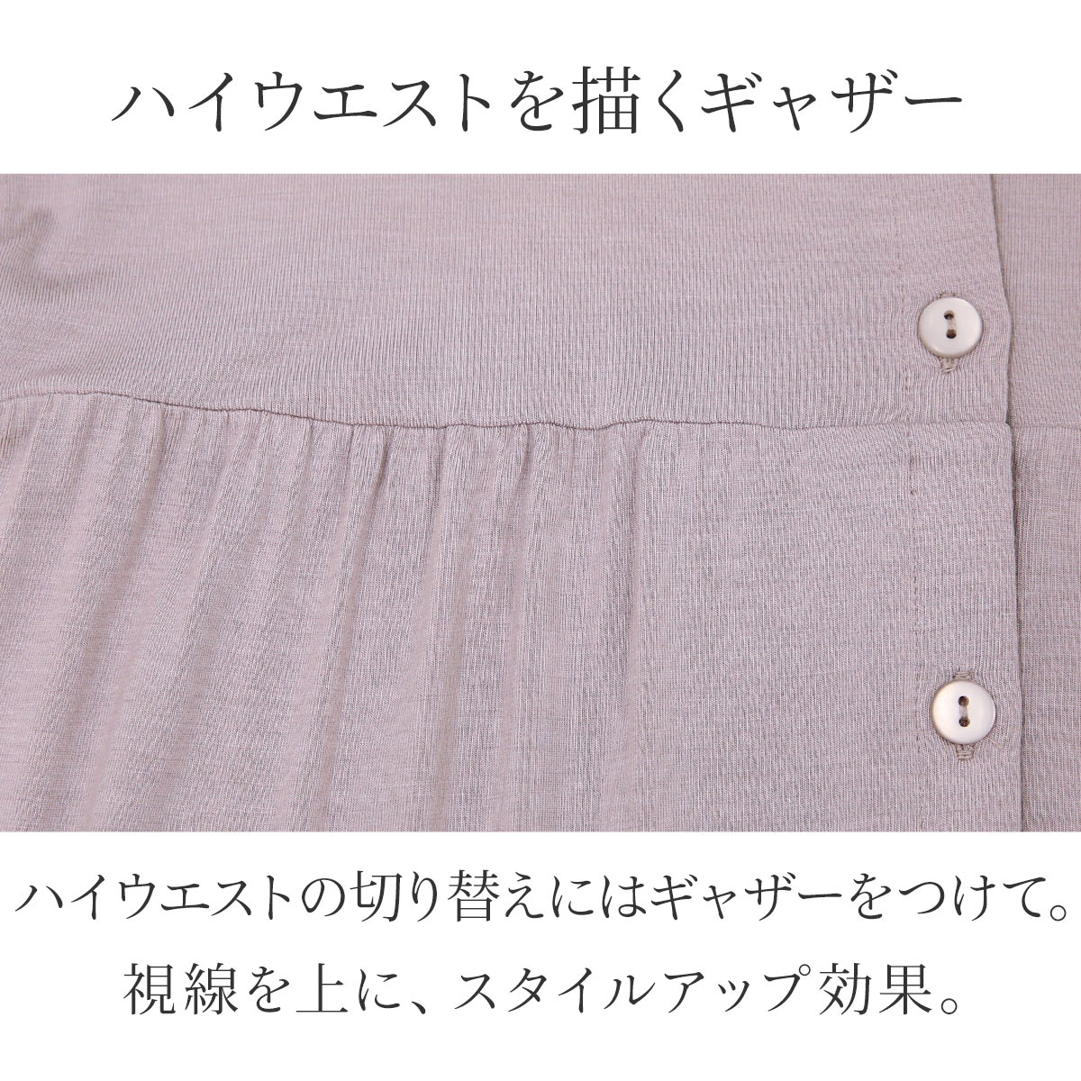 さらりとなめらかな肌あたりのレーヨン混の生地が、ほどよい落ち感とやわらかな風合いでゆったりシルエットをつくります。フロントボタンはバスト部分の間隔を狭めにすることで気になる隙間をカバー。ハイウエストの切り替えでスタイルアップ効果のあるシルエットに仕上げました。ウエスト切り替えのギャザーとフレアの七分袖がすっきりエレガントな印象を演出します。