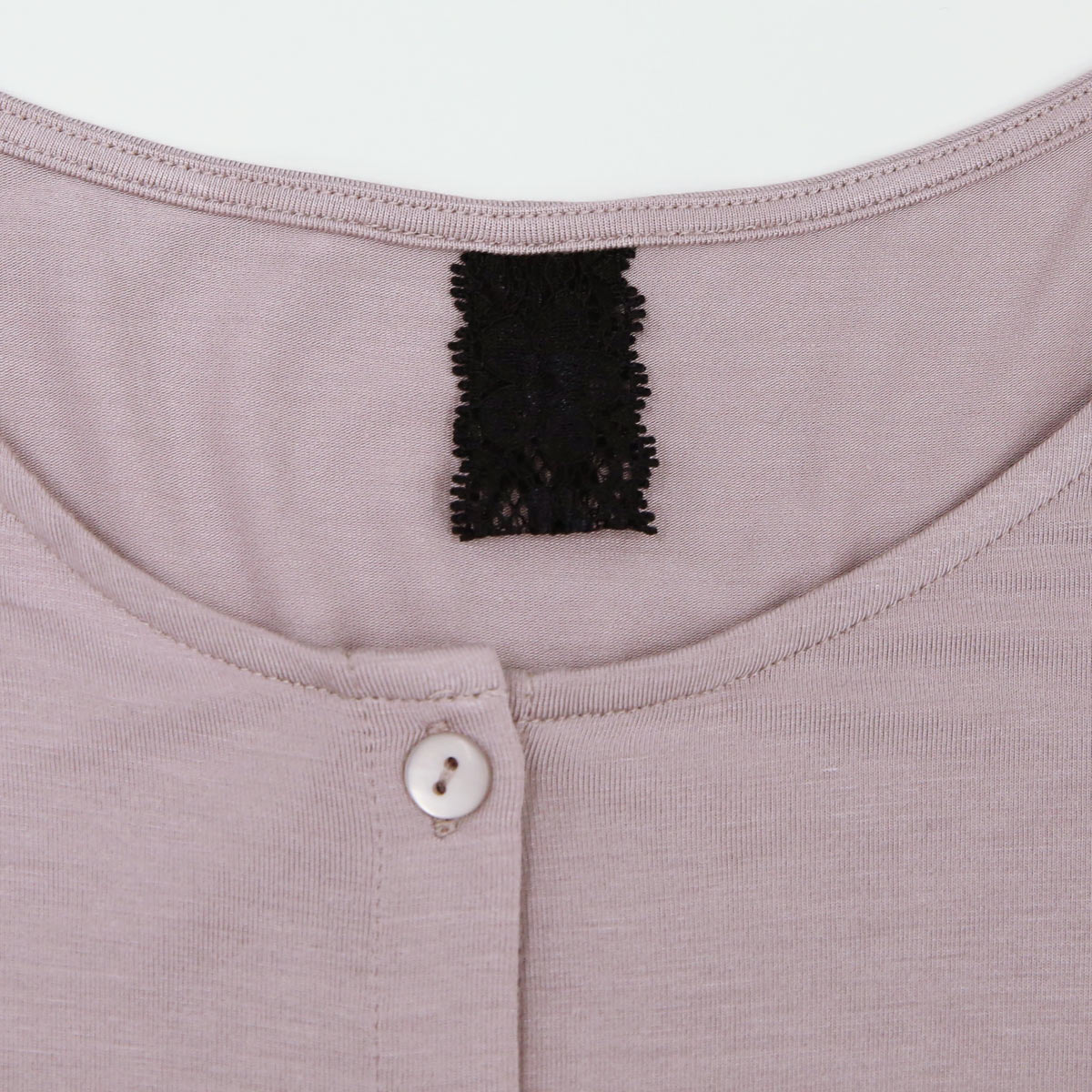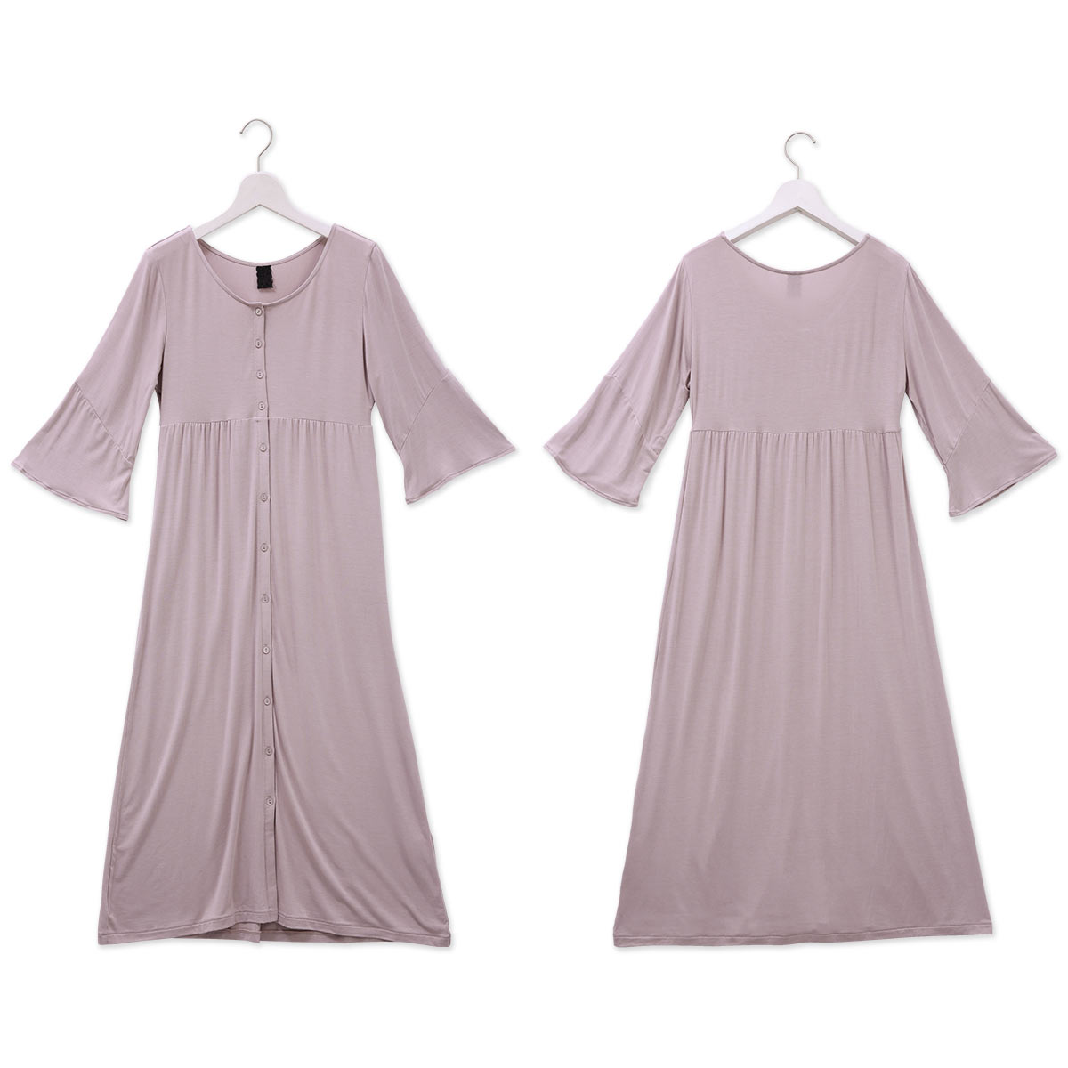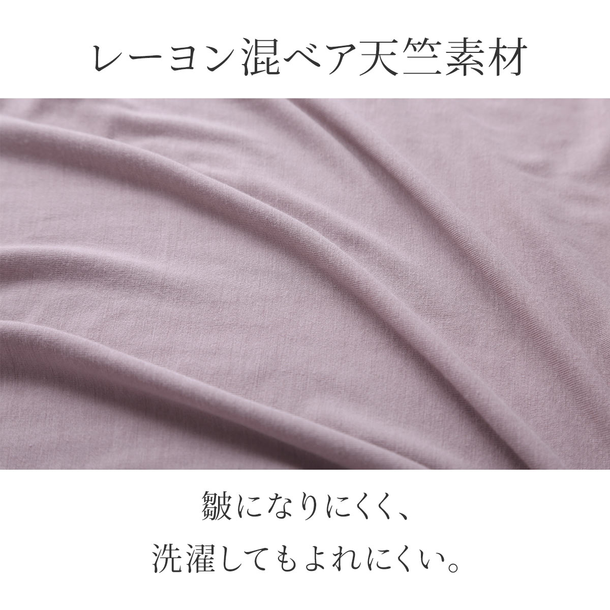 さらりとなめらかな肌あたりのレーヨン混の生地が、ほどよい落ち感とやわらかな風合いでゆったりシルエットをつくります。フロントボタンはバスト部分の間隔を狭めにすることで気になる隙間をカバー。ハイウエストの切り替えでスタイルアップ効果のあるシルエットに仕上げました。ウエスト切り替えのギャザーとフレアの七分袖がすっきりエレガントな印象を演出します。