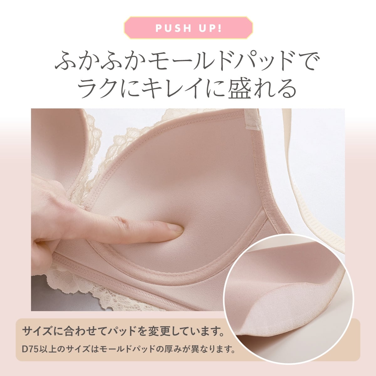 ソフトワイヤーに加え、カップ下の段差をなくしたフラットな構造を採用することで、しっかり支える安定感はそのままに、ワイヤー特有の不快なあたりや食い込みを抑えたストレスフリーな着け心地に。さらに、密着型モールドパッドがバストとの隙間を埋めて内側からふっくらと押し上げ、ボリュームアップを叶えるだけでなく、引き上げ力の強い高弾性ストラップが「夕方になるとせっかくの谷間が逃げてしまう」という悩みも解消。朝の仕上がりを夜までしっかりキープし続ける、まさに『ラク』と『盛り』の両立を叶える、理想のブラです。