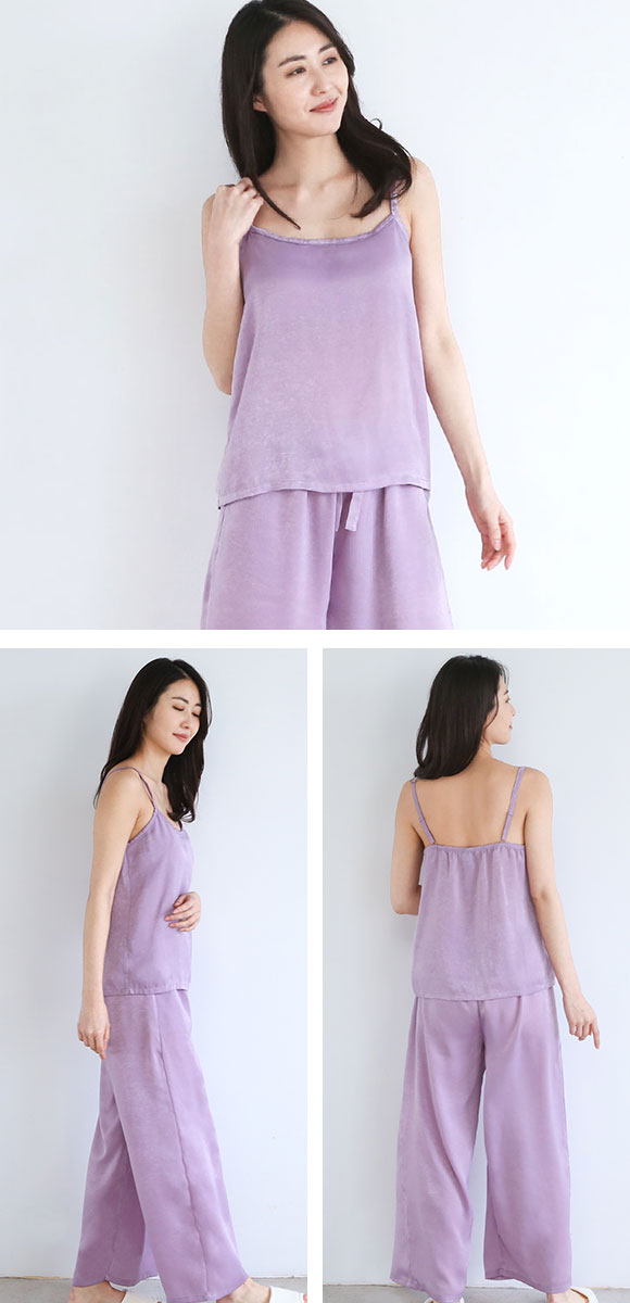 キャミソールは1枚着でリラックスできるパッド入りです。ゆったりめのサイズ感ながらも艶のあるとろみが美シルエットを実現。ワイドパンツは両脇にポケットを配しています。