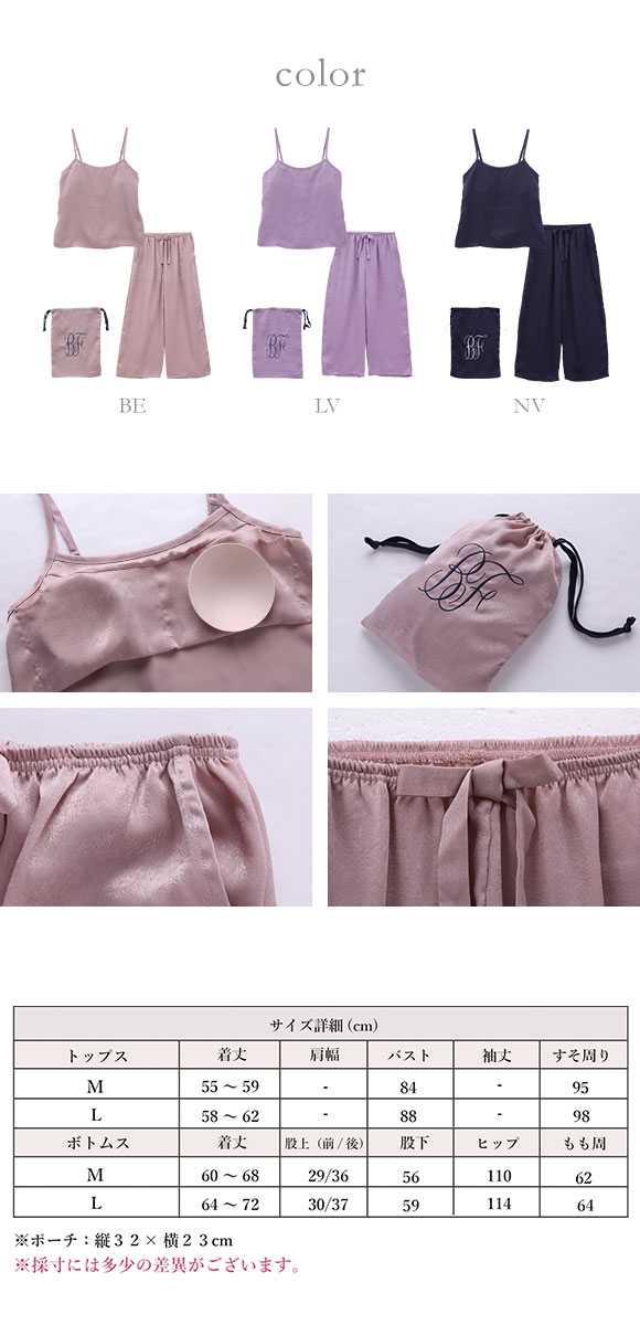 ボトム ・股上前:M約29cm、L約30cm ・股上後:M約36cm、L約37cm ・股下 :M約56cm、L約59cm ・ウエストゴム+飾り紐