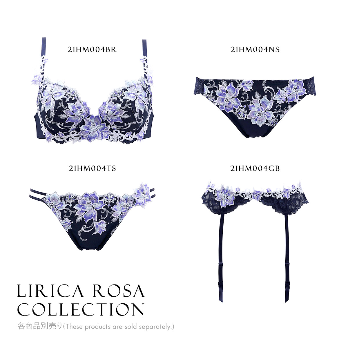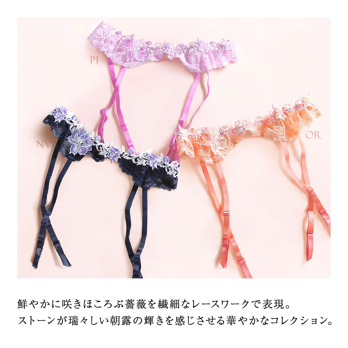 甘美な薔薇が肌に色づくLirica Rosaシリーズ。色鮮やかに咲く薔薇のアップリケをケミカルレースに乗せ、流れるようにウエストまわりを彩ったガーターベルト。レースのフリルがふわりと浮かべる可憐な表情に、胸が高鳴るよう。バックは華奢にすっきりと仕上げ、たおやかな佇まいを感じさせます。
