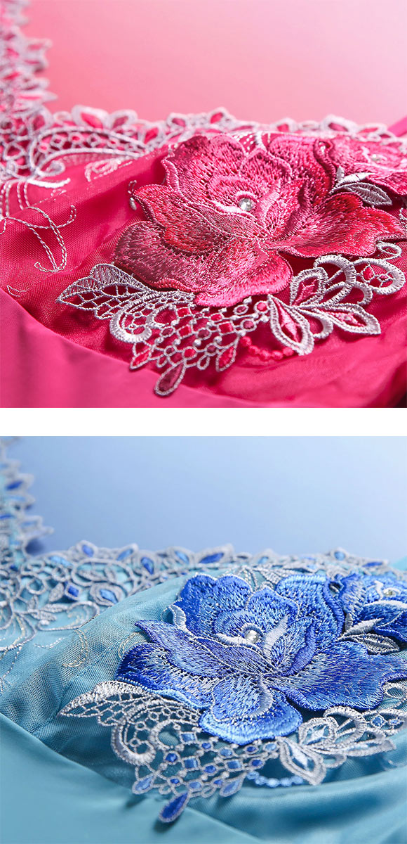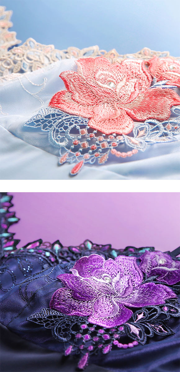 流れるように刺繍を巡らせた姿は、宮廷を彩る美しい調度品をイメージ。フロントを飾る絢爛なシャンデリアに見立てたモチーフが存在感を放ち、レースに織り込まれたラメ糸がさりげない煌めきを添えます。美を追求する女性たちの磨かれた感性を表現した、華やかで優美なデザイン。