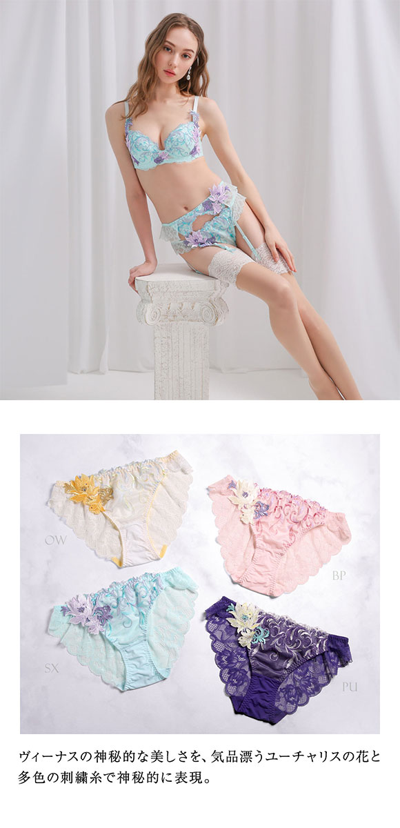 太陽のような輝きを放つオフホワイト、神聖な泉を思わせるサックス、女神をイメージしたフェミニンなベビーピンク、幻想的な魅力溢れるパープルの4色展開。カラーごとに異なる表情を楽しめる豊富なラインナップです。