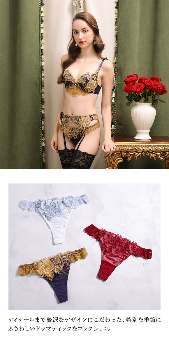 クリスマスローズをモチーフに、ディテールまで贅沢なレース使いにこだわったゴージャスなデザイン。レースの立体的な艶めきやラメ糸の輝きが重厚感の中にも華やかさを演出します。まるで装飾品を身に着けているかのような、特別な季節にふさわしいコレクションに仕上げました。