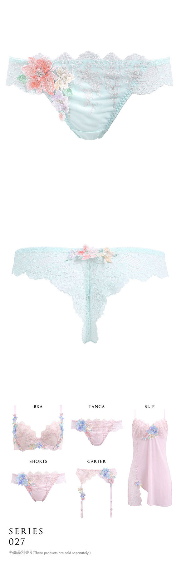 カラーはホワイト、ピンク、サックスの3色展開。ロマンティックな色合いをベースに、アップリケの繊細なプリントが映える清楚で爽やかなカラーリングに仕上げました。