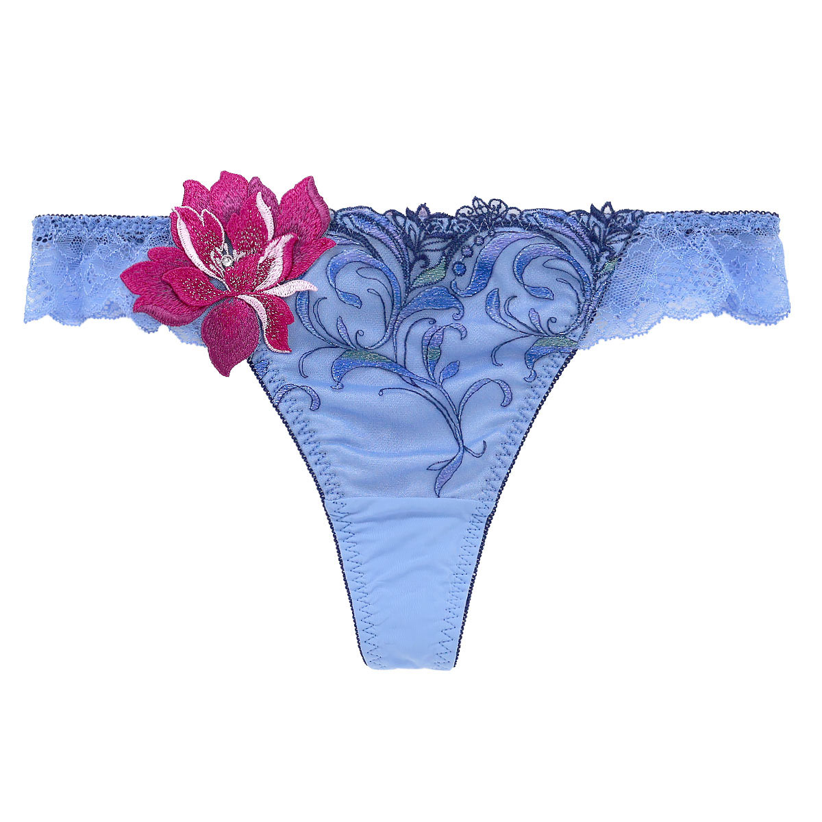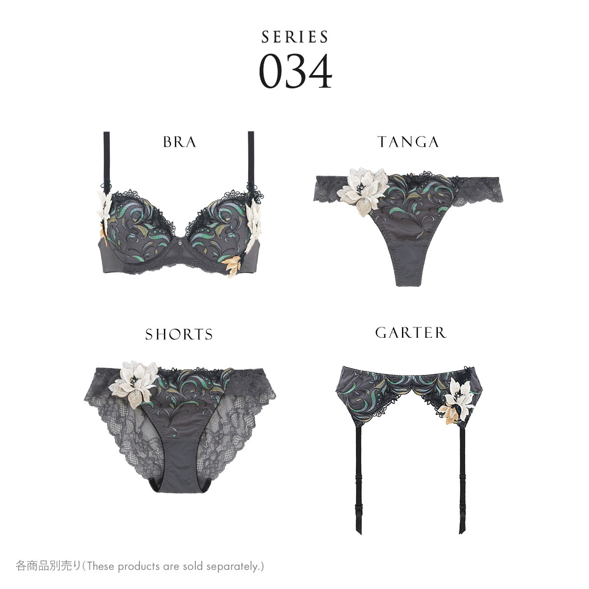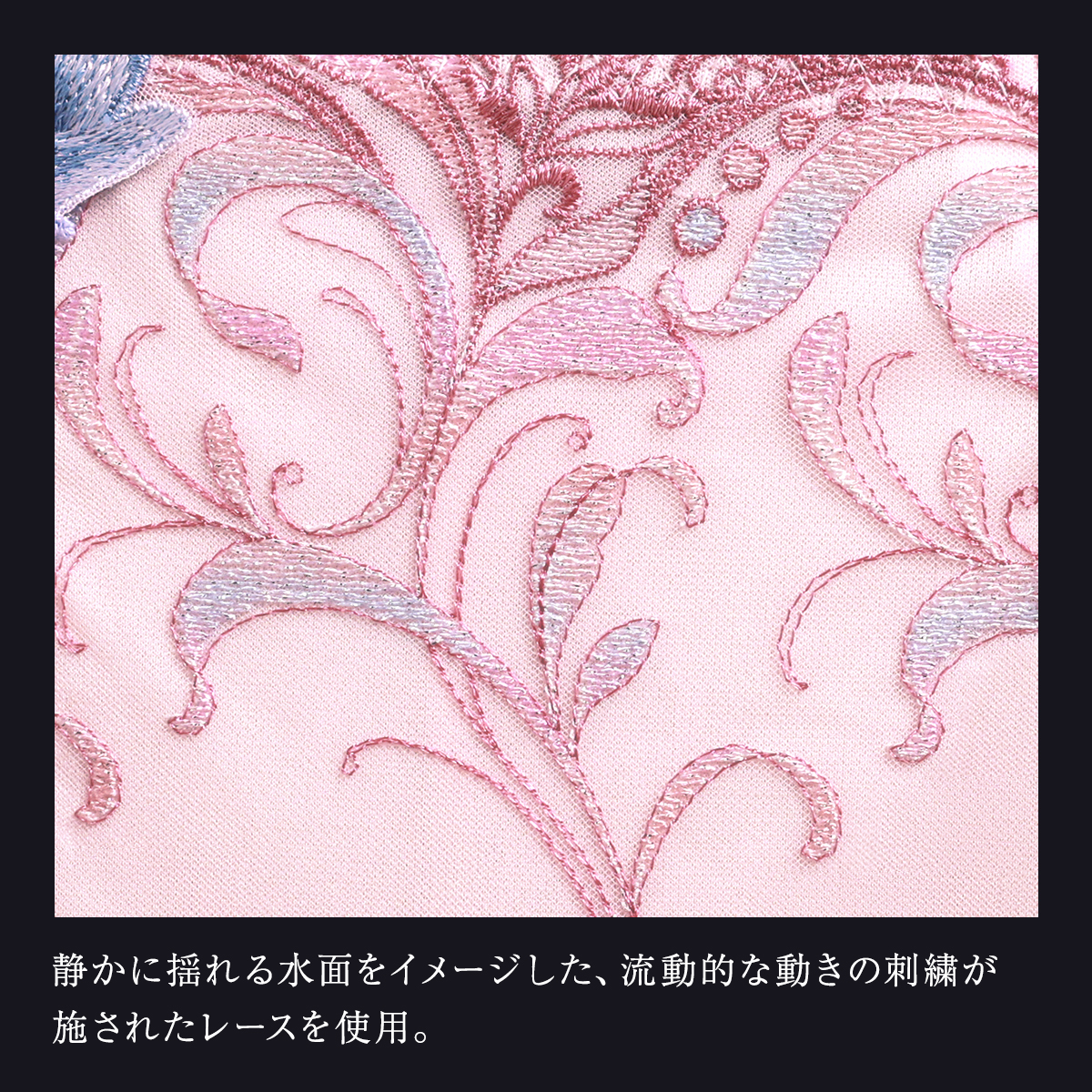 フロントからサイドに咲き誇る睡蓮の立体アップリケが目を惹き、バックスタイルにも可憐な花をあしらった、Tバックショーツはラメ糸の輝きと繊細なレースが後ろ姿まで優雅に演出する一枚です。