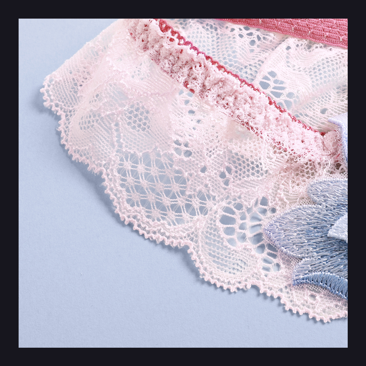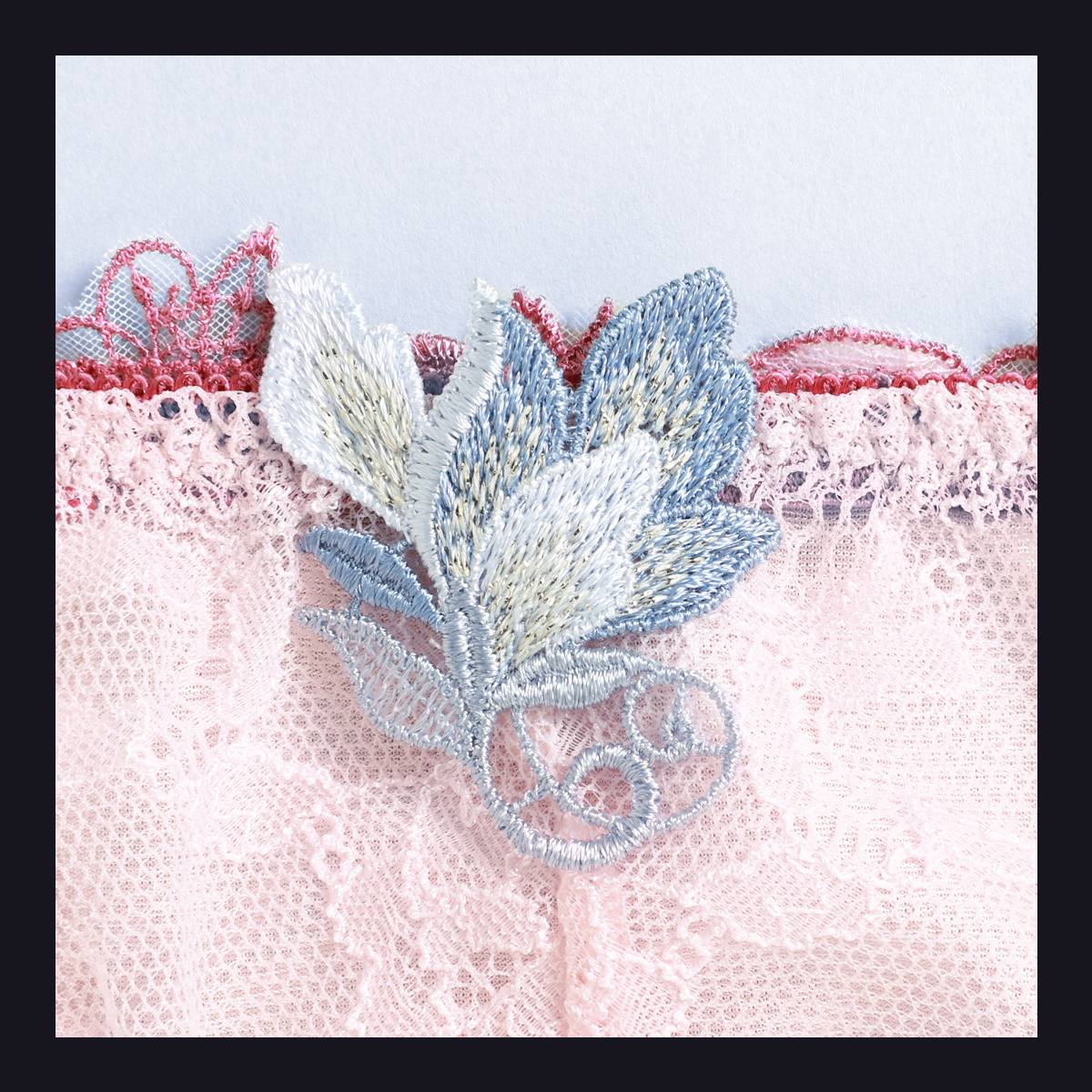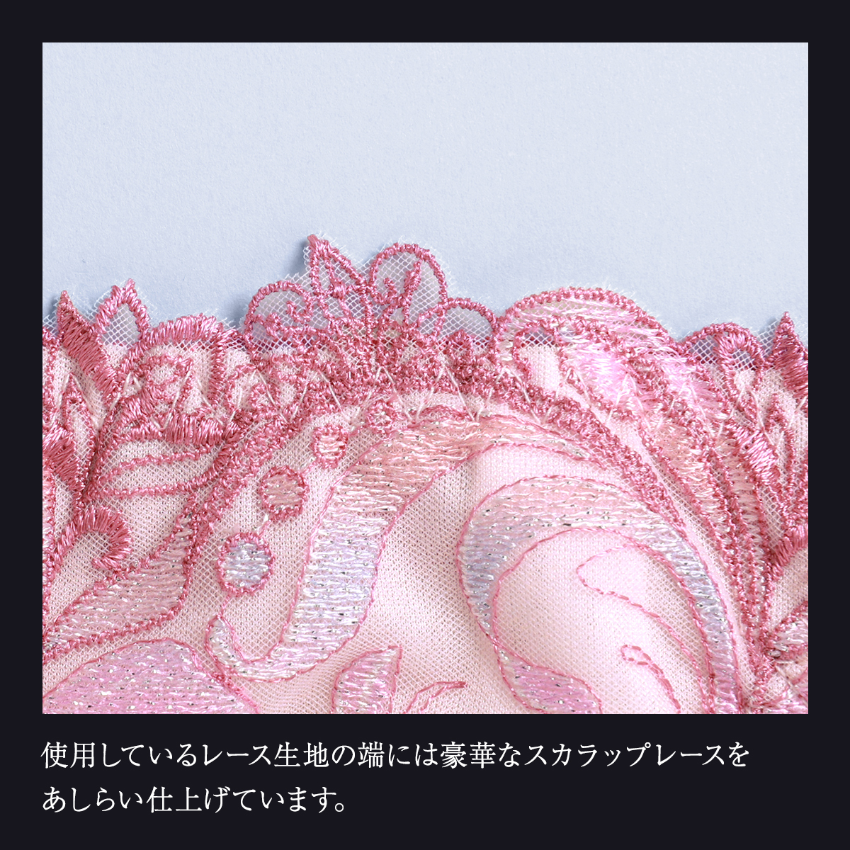 フロントからサイドに咲き誇る睡蓮の立体アップリケが目を惹き、バックスタイルにも可憐な花をあしらった、Tバックショーツはラメ糸の輝きと繊細なレースが後ろ姿まで優雅に演出する一枚です。