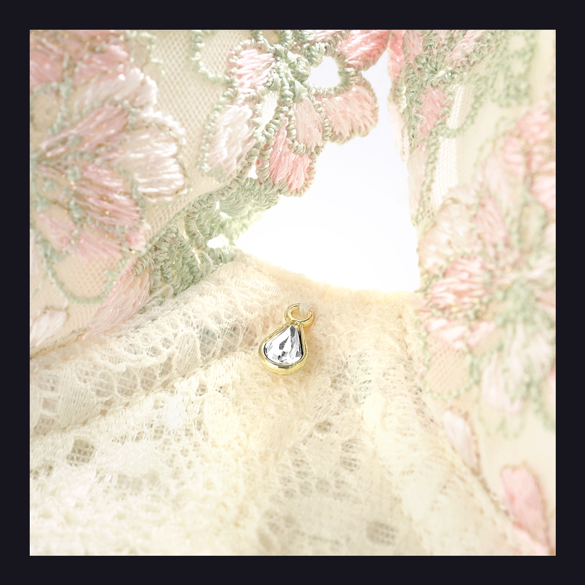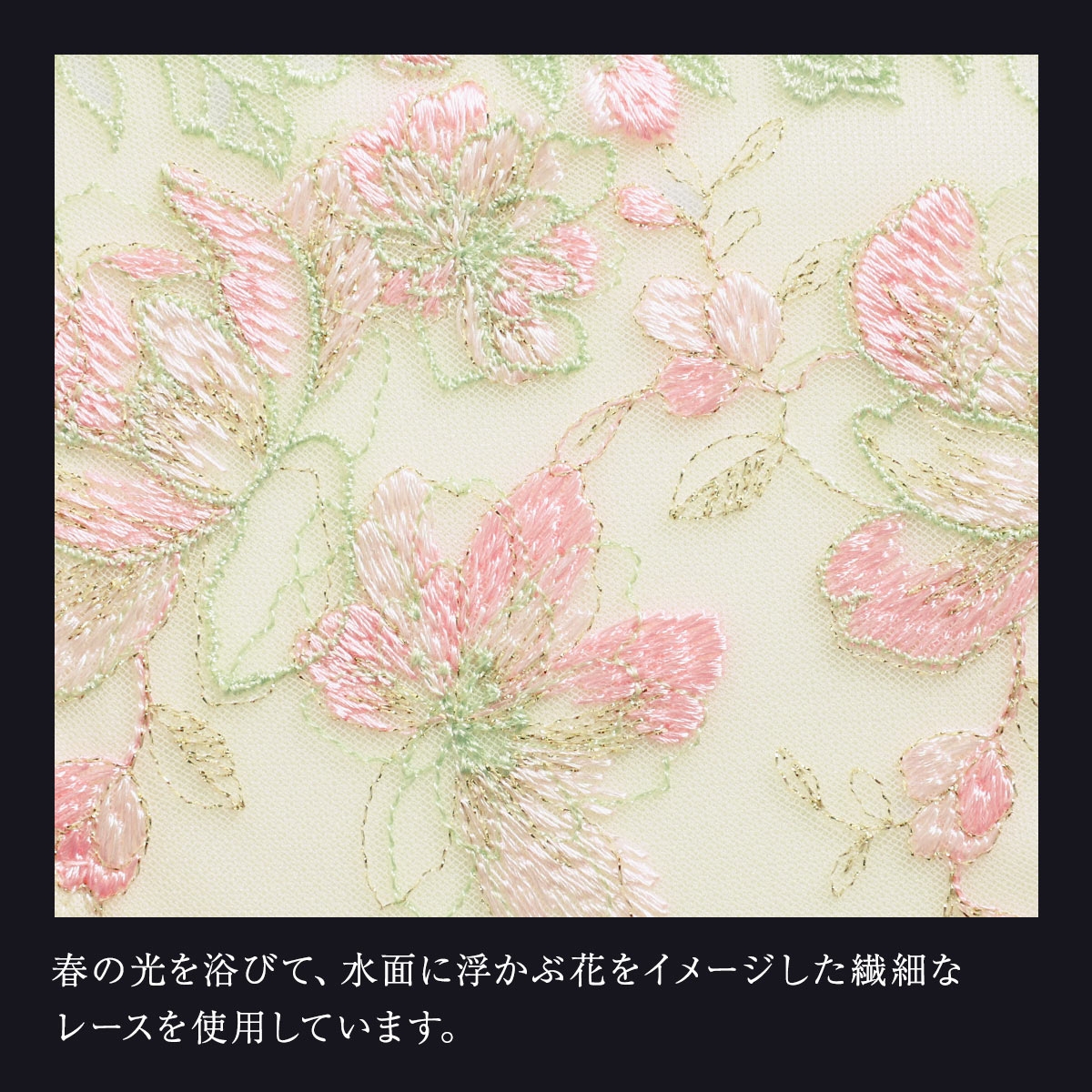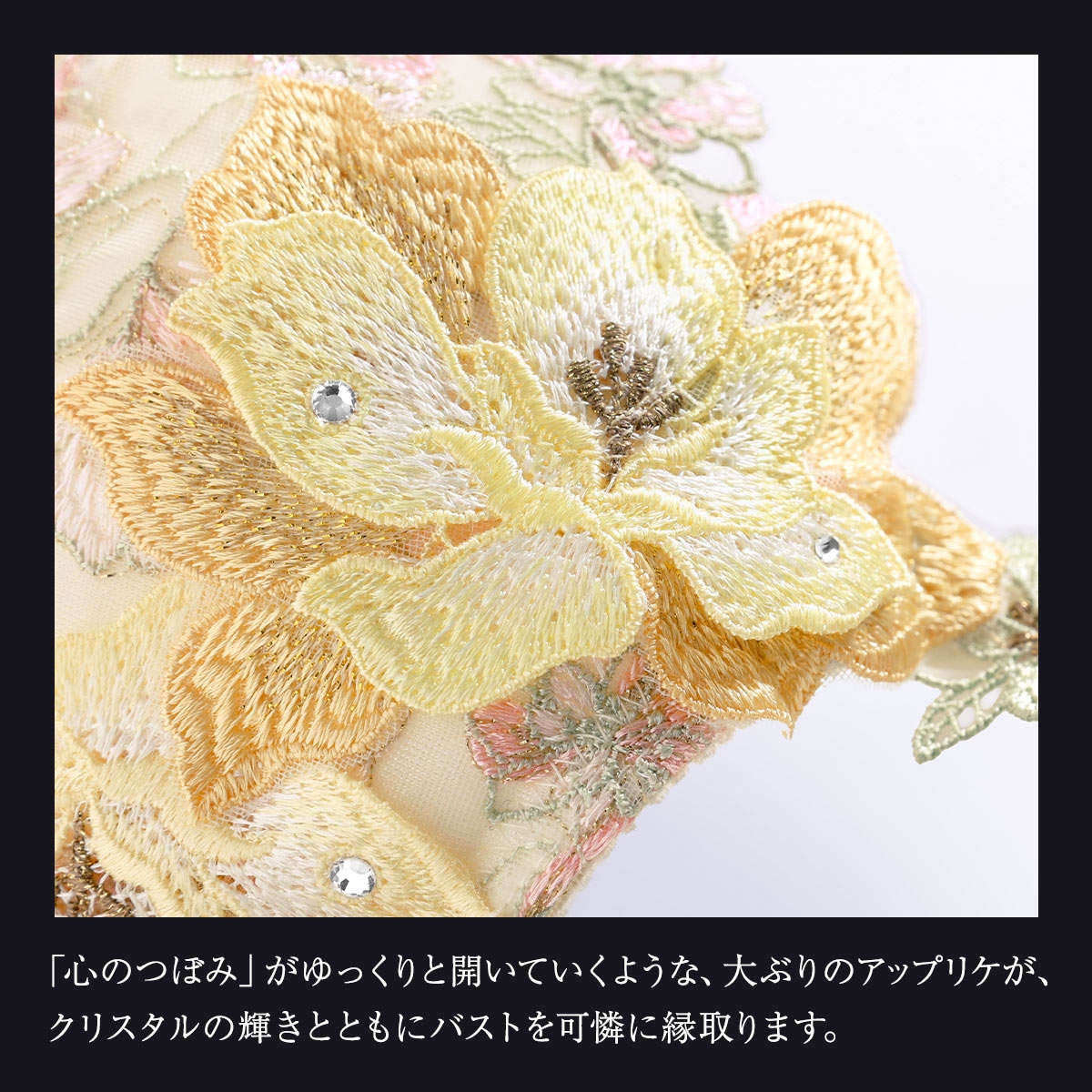 HIMICO定番の「クラシックフィット」がバストを中央に寄せ、ふっくらとしたデコルテと高い谷間を叶えます。水面に浮かぶ花をイメージした繊細なレースと大ぶりの立体アップリケが、クリスタルの輝きとともにバストを可憐に縁取ります。