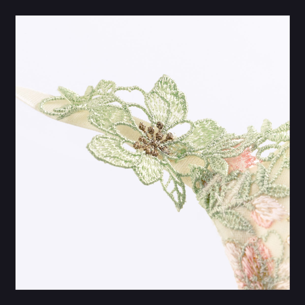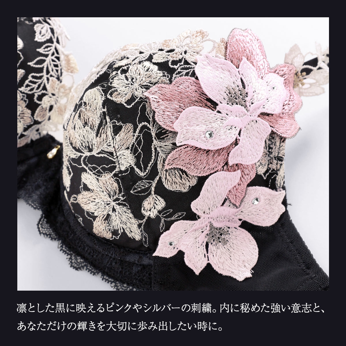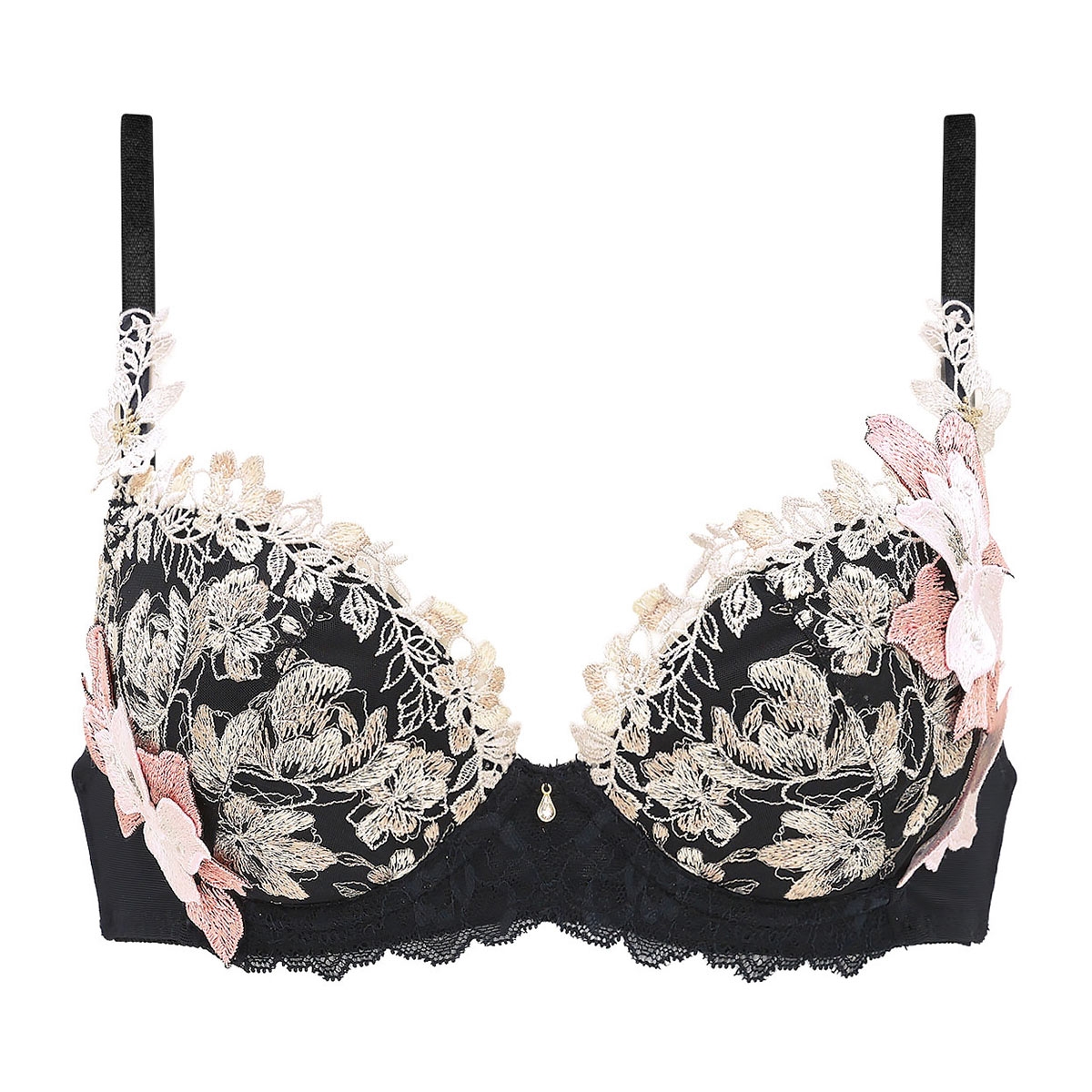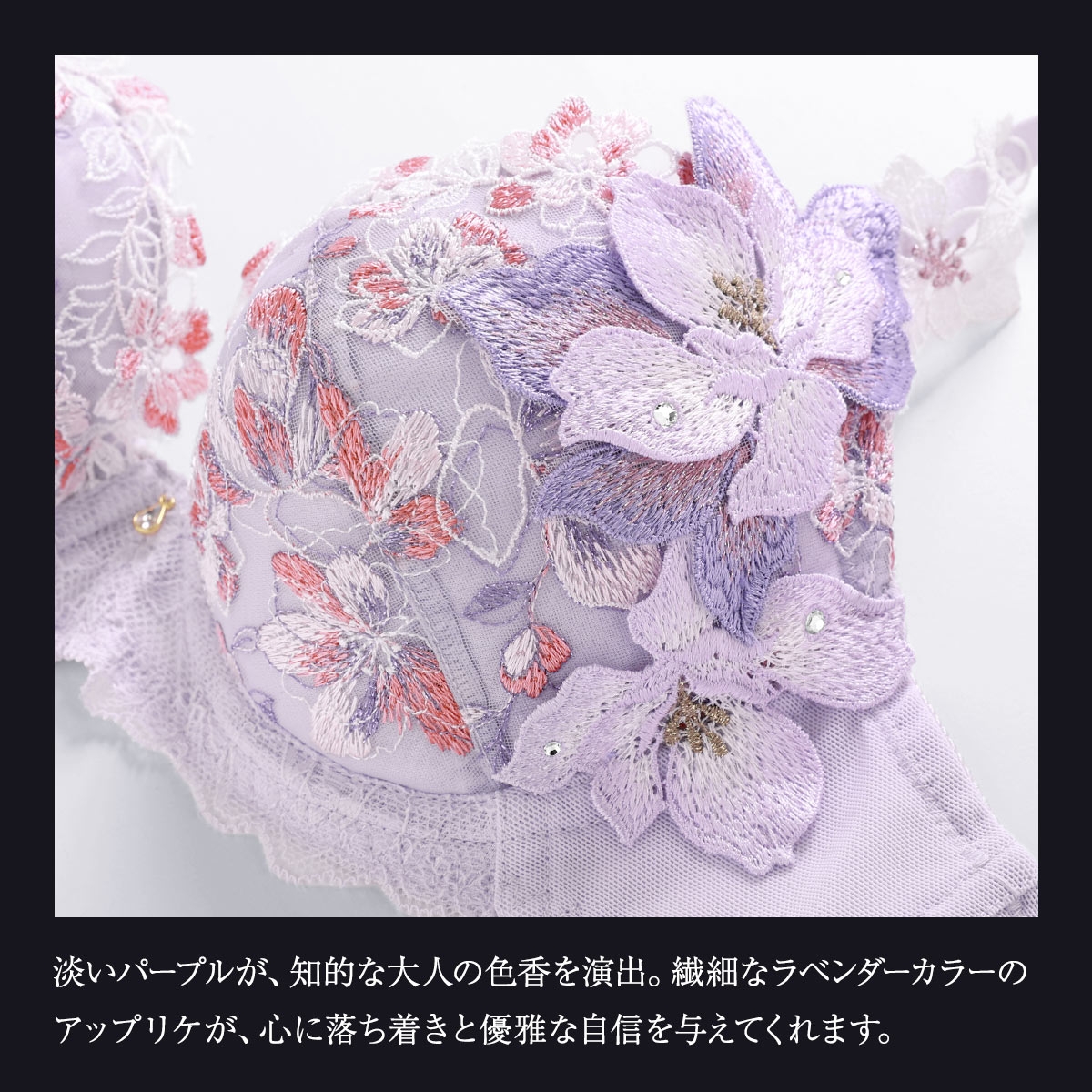 HIMICO定番の「クラシックフィット」がバストを中央に寄せ、ふっくらとしたデコルテと高い谷間を叶えます。水面に浮かぶ花をイメージした繊細なレースと大ぶりの立体アップリケが、クリスタルの輝きとともにバストを可憐に縁取ります。