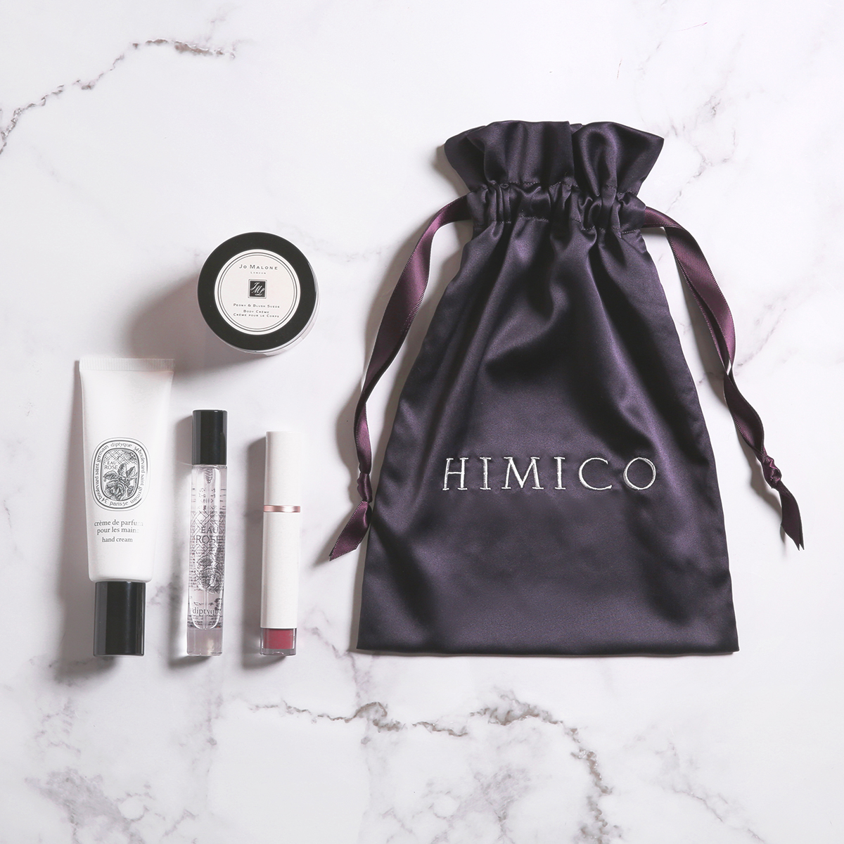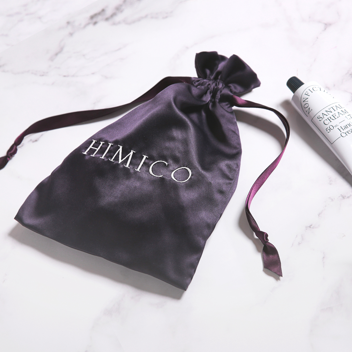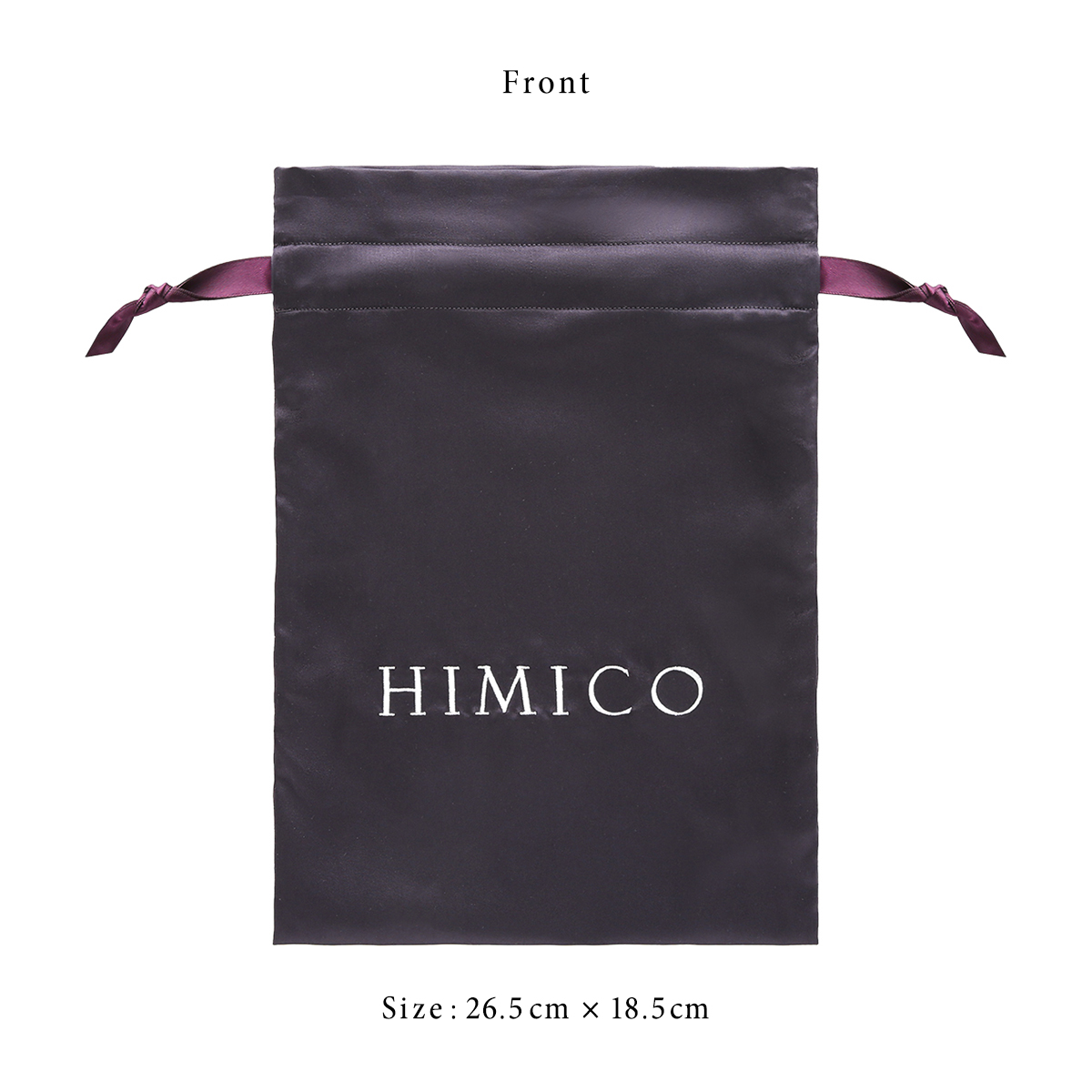 上品に艶めくサテン生地にホワイトのロゴを入れた、大人の気品漂う巾着タイプのポーチです。旅行やお泊りなど使い場所を選ばないシンプルかつ高級感のあるデザインに仕上げました。