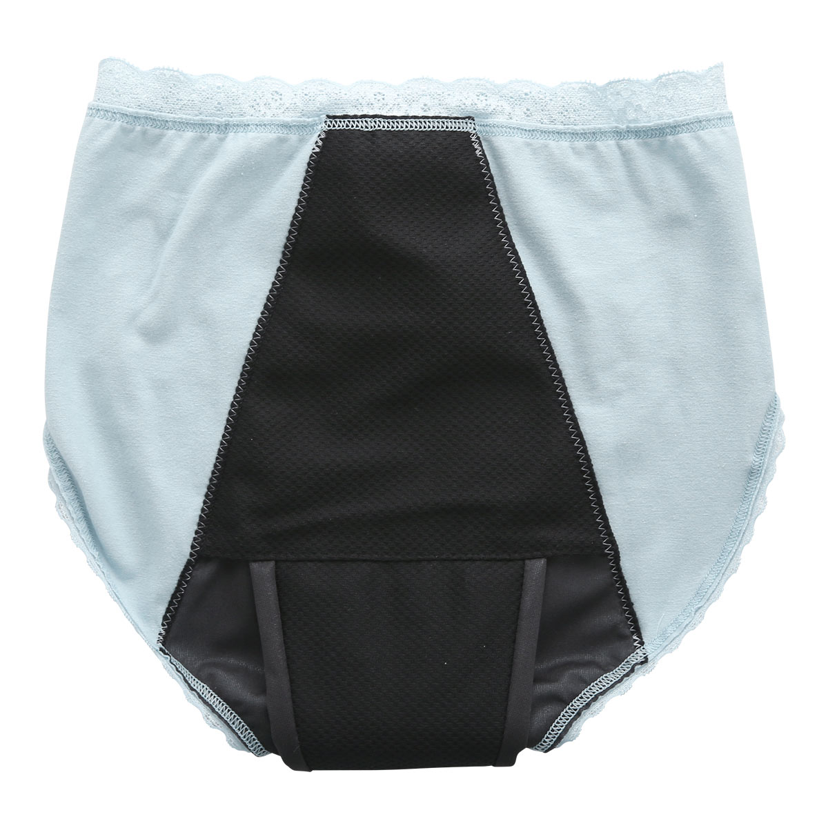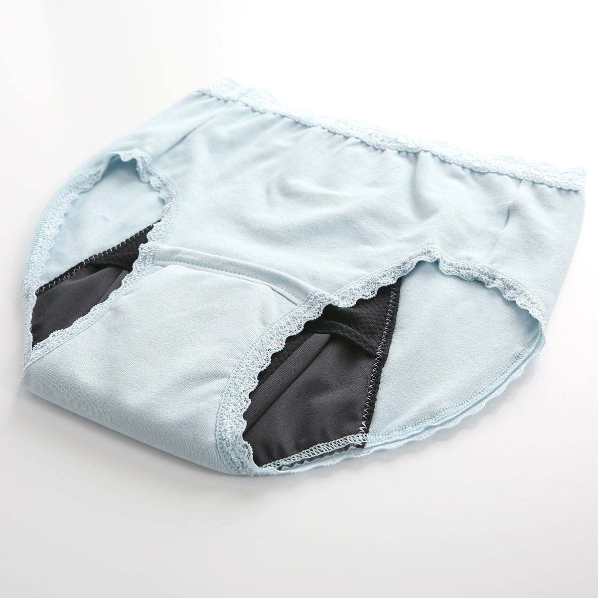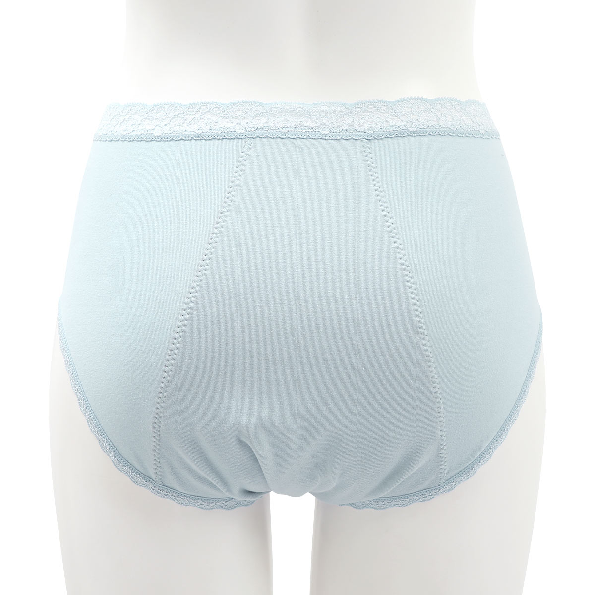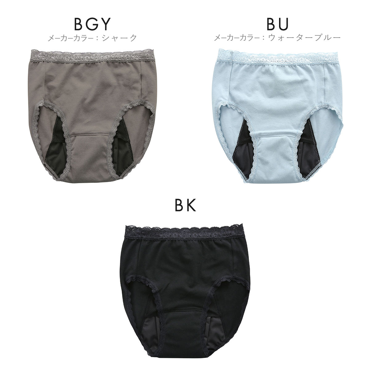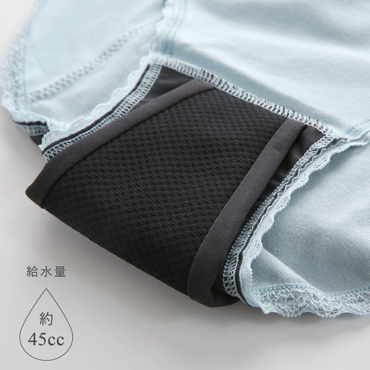 | 仕 様 | ・日本製 ・吸水ショーツ、吸水量約45CC ・羽つきナプキン対応 ・二重防水構造 ・縦横に伸縮性あり(防水シート部はなし) ・透感:なし ・抗菌消臭 |