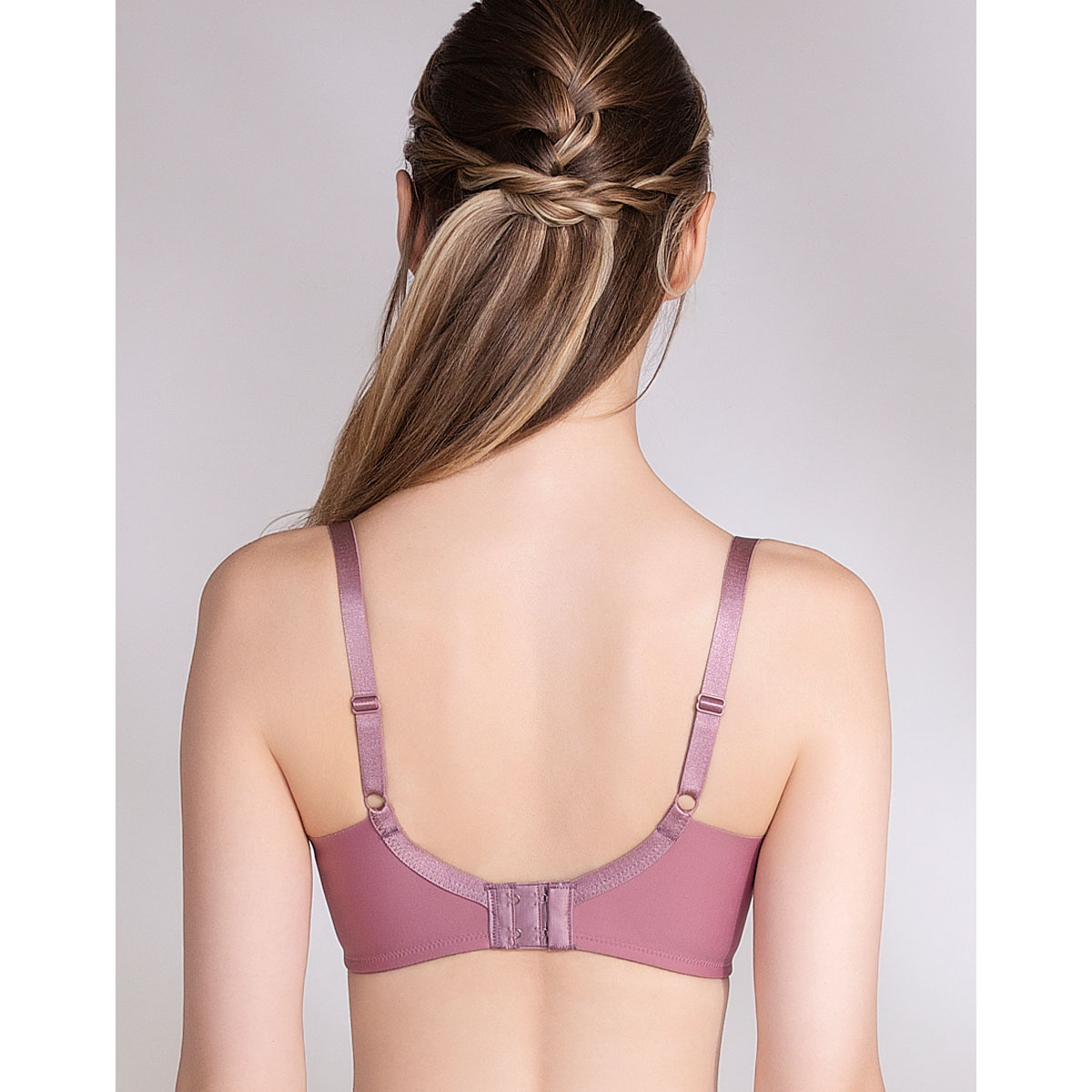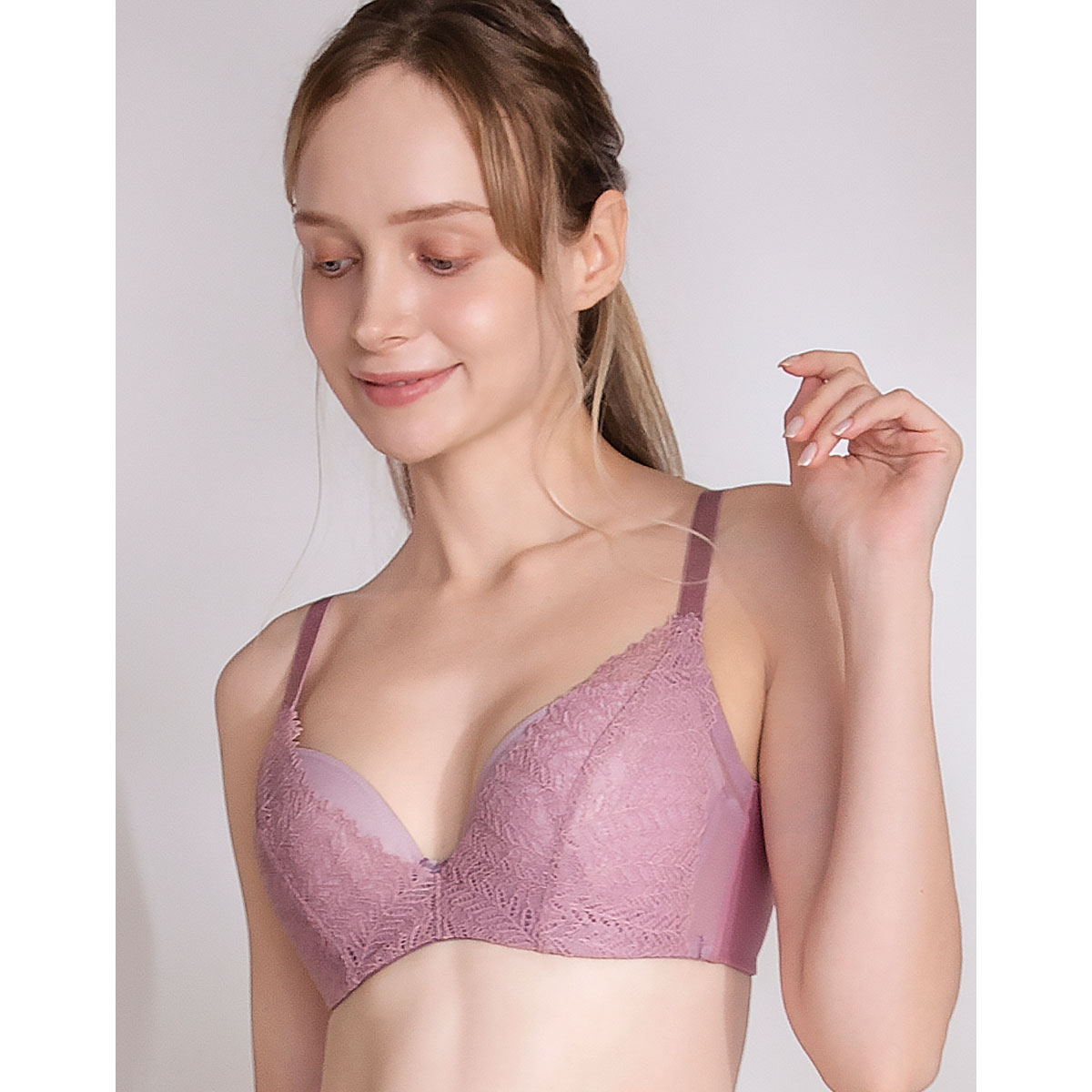 脇高設計による幅の広い脇布でハミ肉をキャッチし、しっかり収めることでバストサイドのラインをすっきりととのえる。