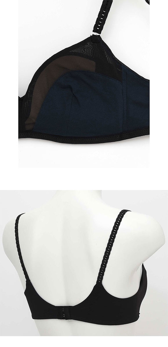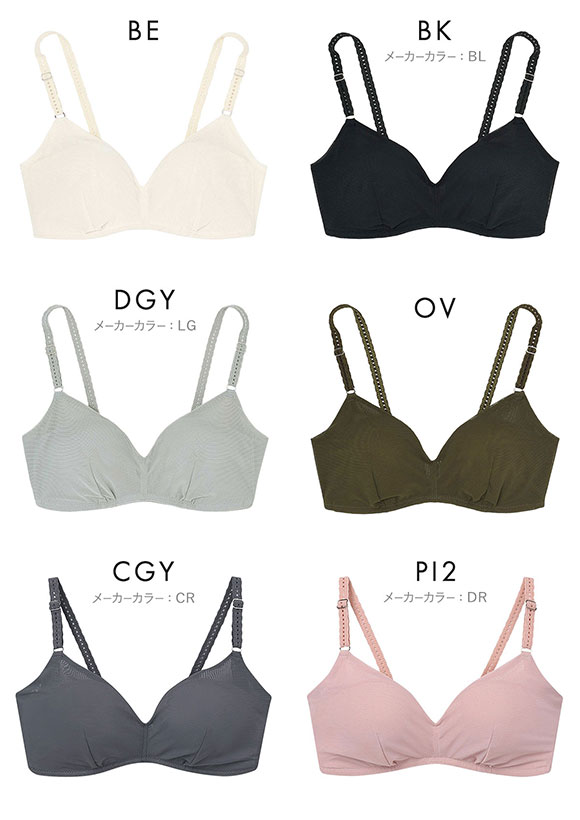 表と裏の素材のカラーを変えることにより、カラーの楽しさや奥行きを演出。上辺にゴムを使用しない脇高設計でしめつけ感が少なくすっきりなめらかで、ほどよい高さと厚みのウレタン成型カップがナチュラルなバストをメイク。肌側には伸びのよいレーヨン綿混素材を使用しているのでやさしい肌ざわり。
