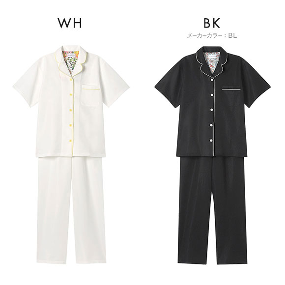 可愛く着られて、ちょっぴり高級感のある開襟シャツの半袖パジャマ。さらっとした肌あたりの生地なので春夏パジャマとしてオススメ。パイピングのカラーと背中のLIBERTY柄がポイント。