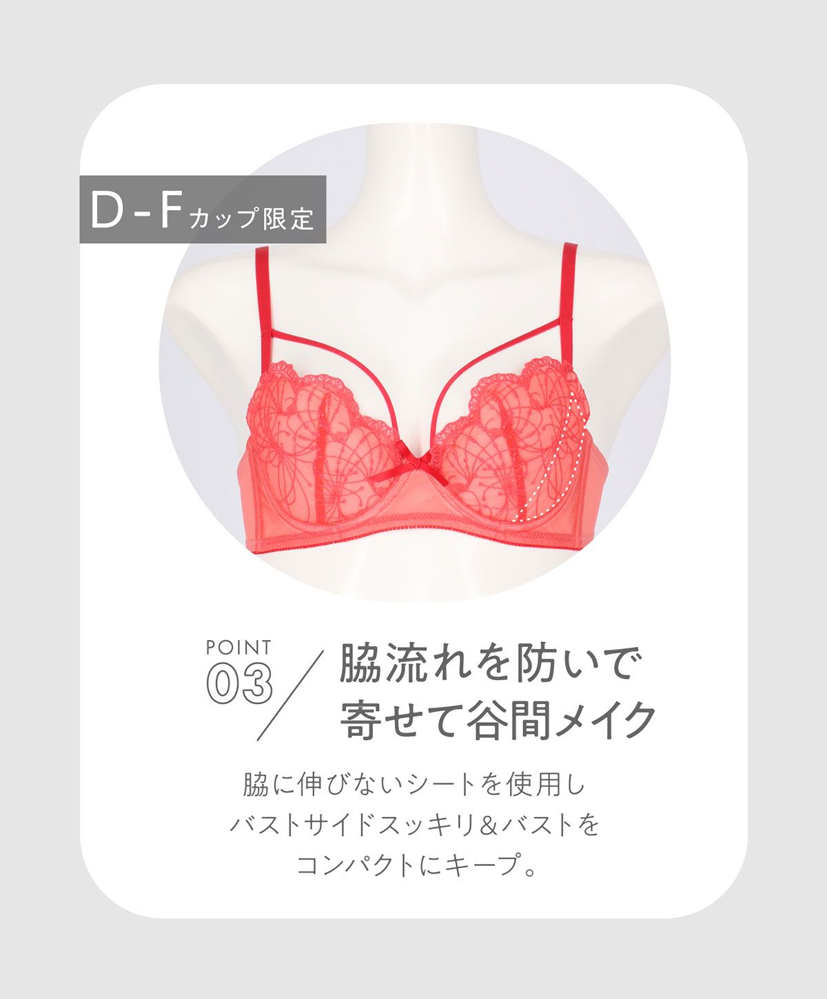 D~Fカップには脇に伸びないシートを使用し、バストサイドスッキリ&バストをコンパクトにキープ。
