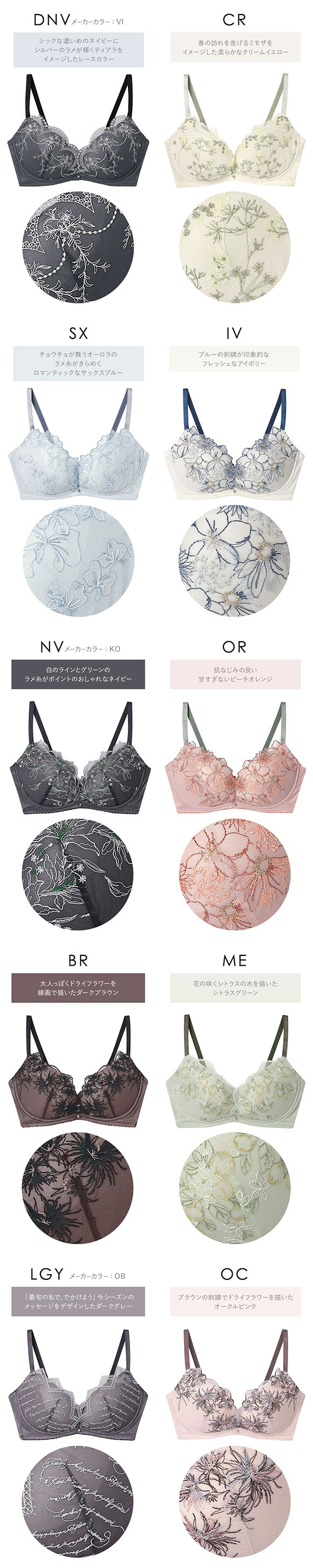 | サイズ | レディース A70、A75、B65、B70、B75、C65、C70、C75、D65、D70、D75、E65、E70、E75、F65、F70、F75、G65、G70 |