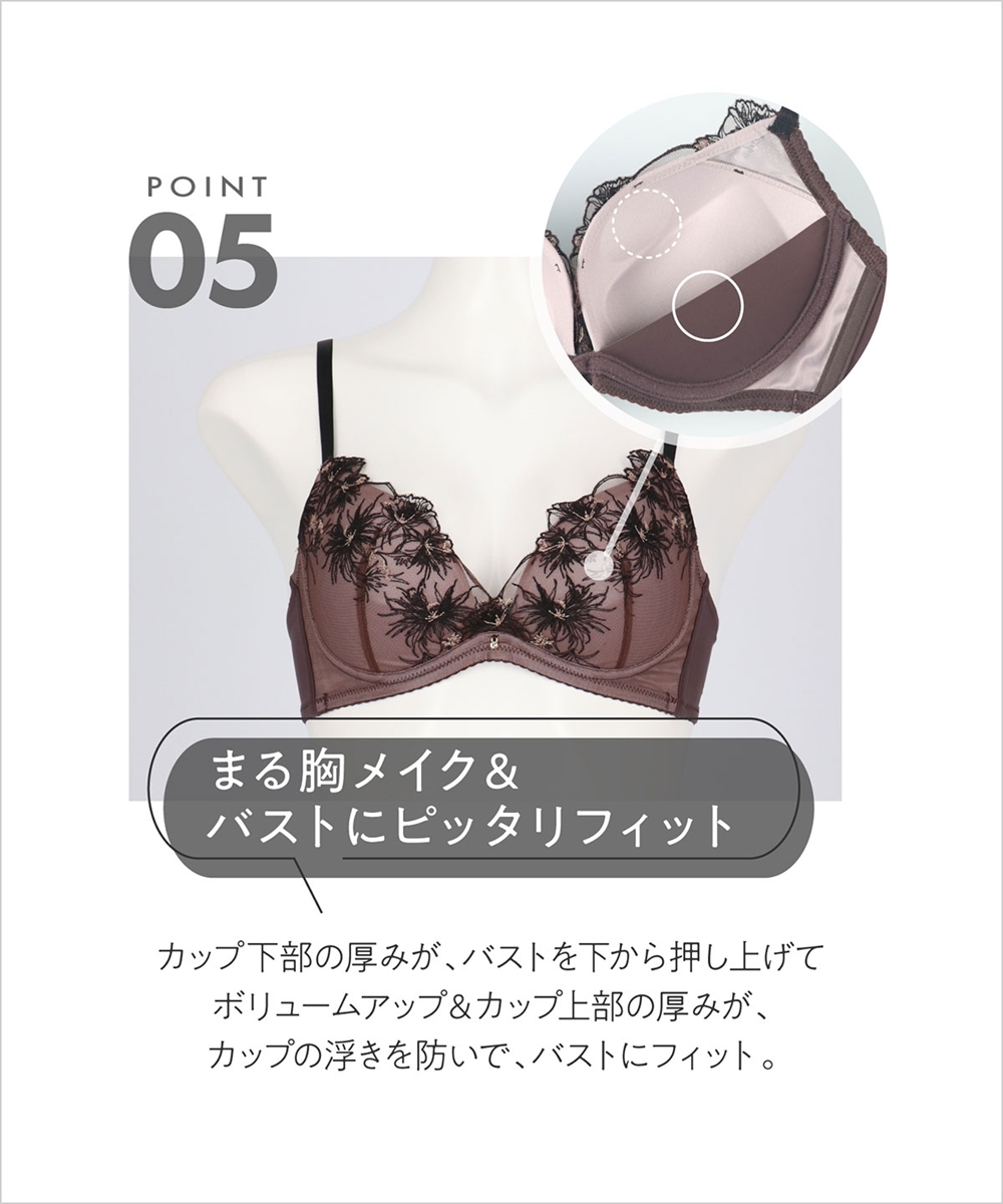 カップ下部の厚みがバストを下から押し上げボリュームアップ。カップ上部の厚みがカップの浮きを防いでバストにフィット。