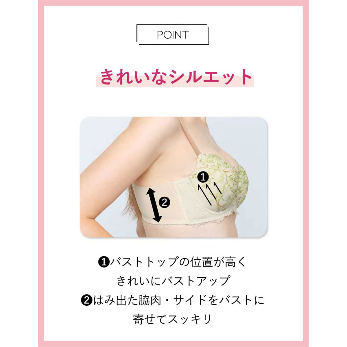 バストトップの位置が高く、きれいにバストアップ。脇高設計と幅広のバックで、はみ出た脇肉・サイドをバストに寄せてすっきり。