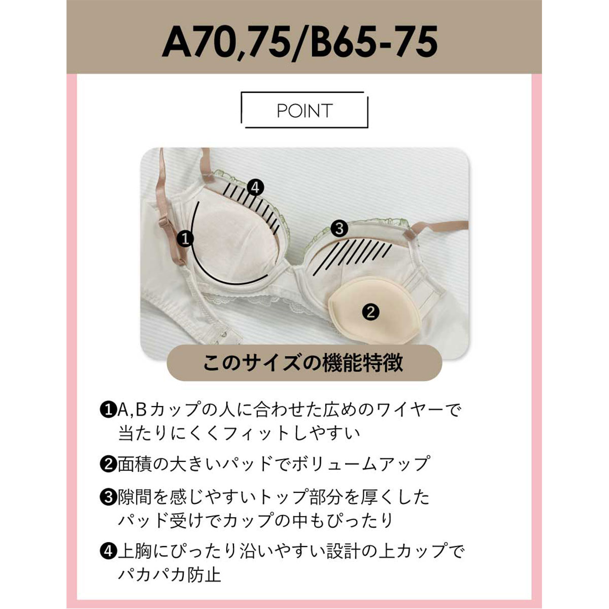 | サイズ | レディース A70、A75、B65、B70、B75、C65、C70、C75、D65、D70、D75、D80 |