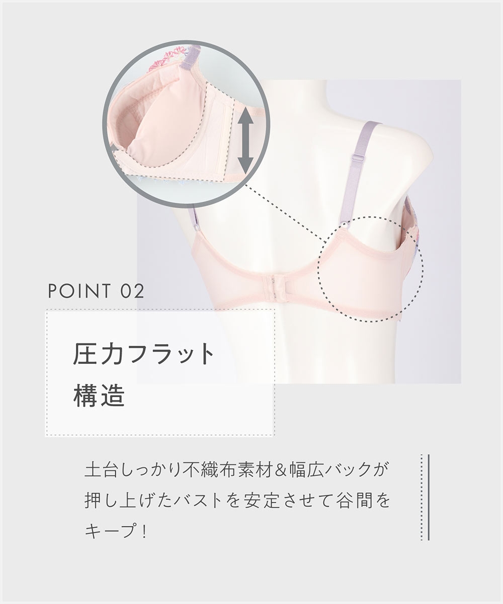 ダブル盛パッドと土台しっかり不織布でワイヤーを感じにくく、押し上げたバストをキープし、しっかり盛り胸をキープ。