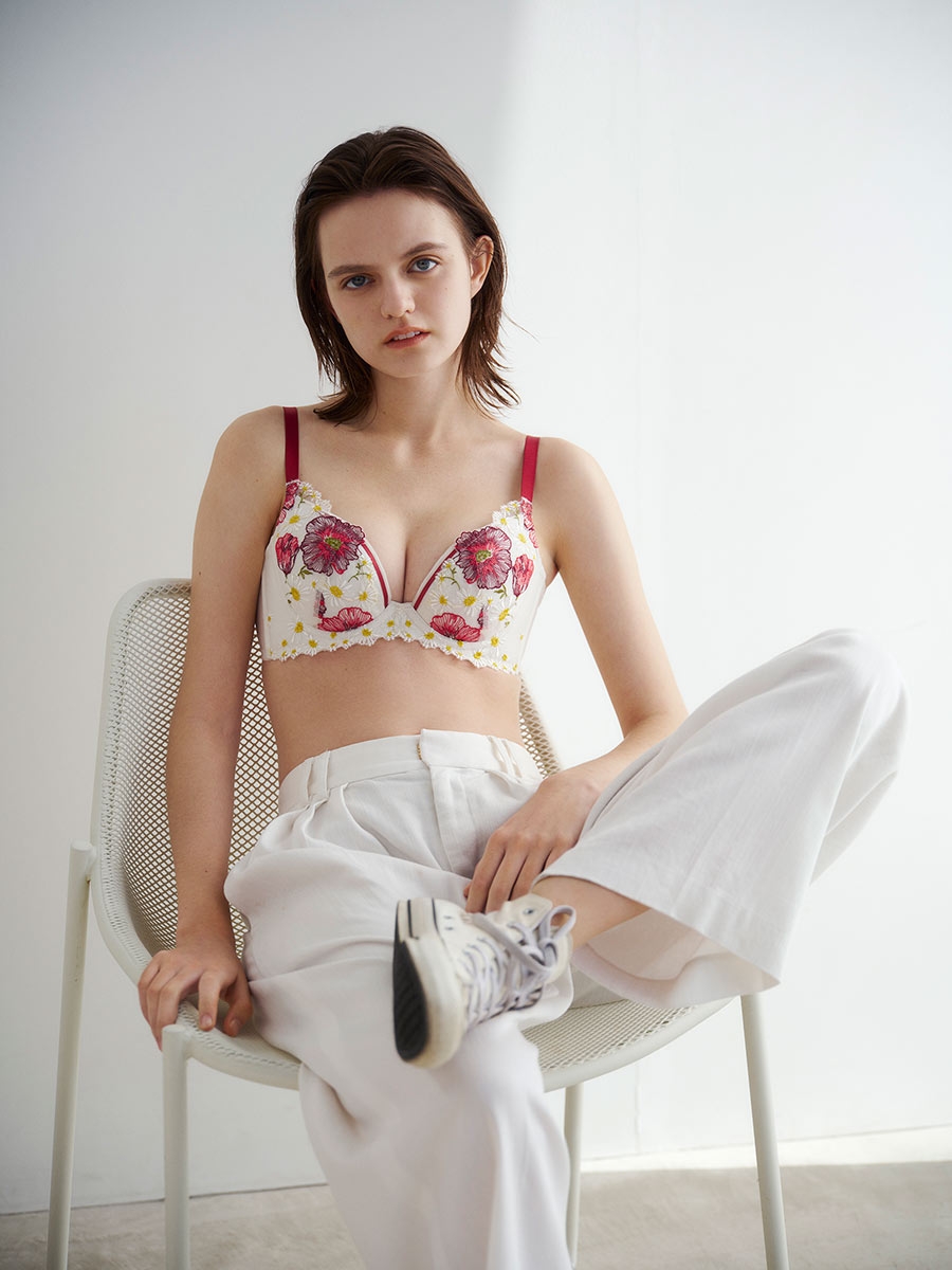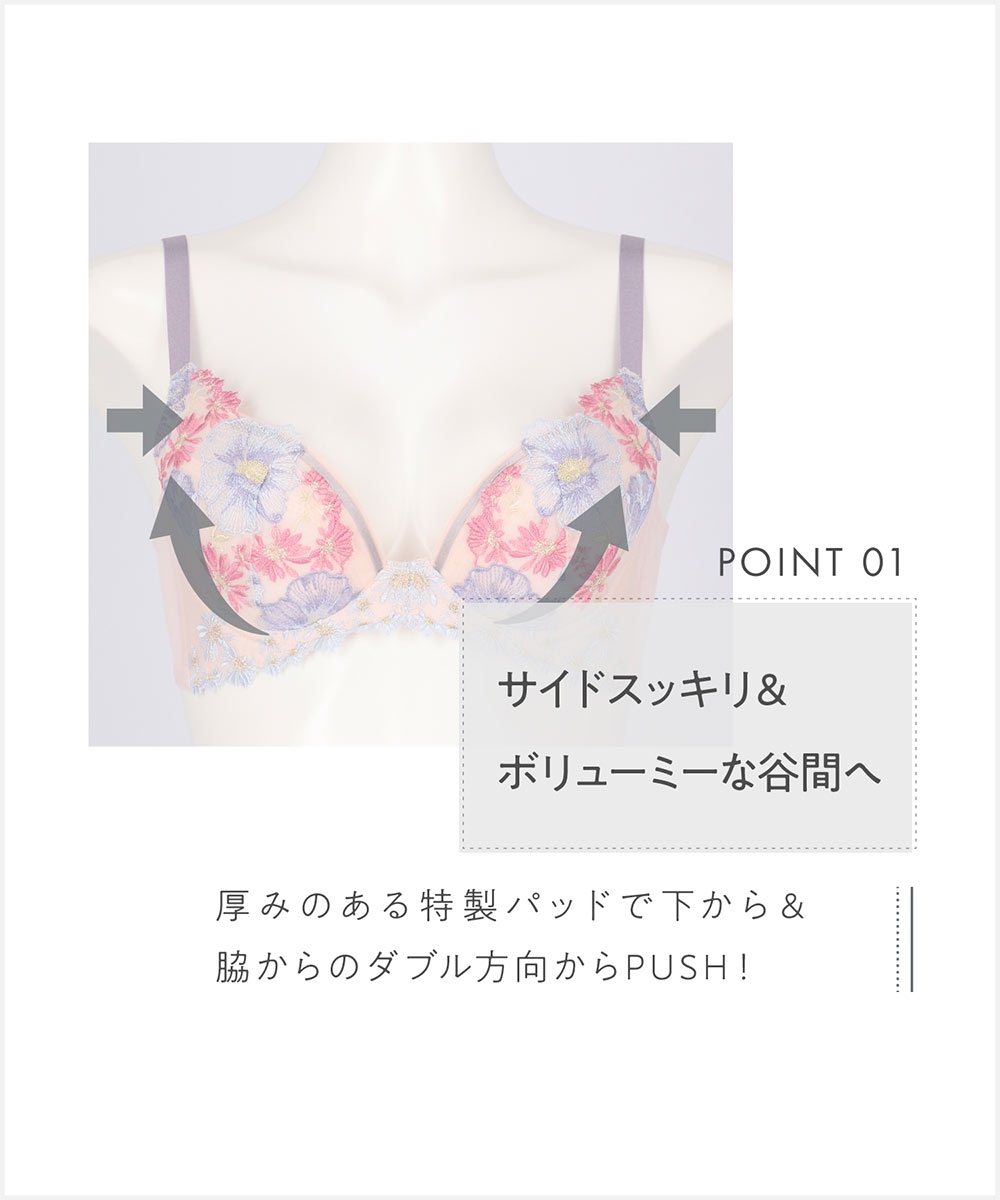 谷間くっきり、脇スッキリ、憧れの谷間がつくれるブラジャー。バストの高さと寄せ感をダブルでアップして、スタイルアップを提案。