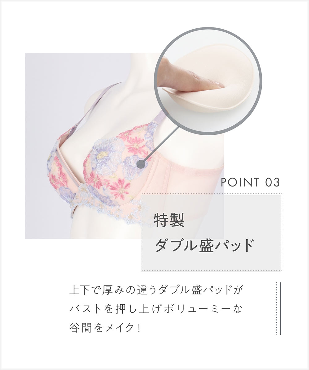 ダブル盛パッドと土台しっかり不織布でワイヤーを感じにくく、押し上げたバストをキープし、しっかり盛り胸をキープ。