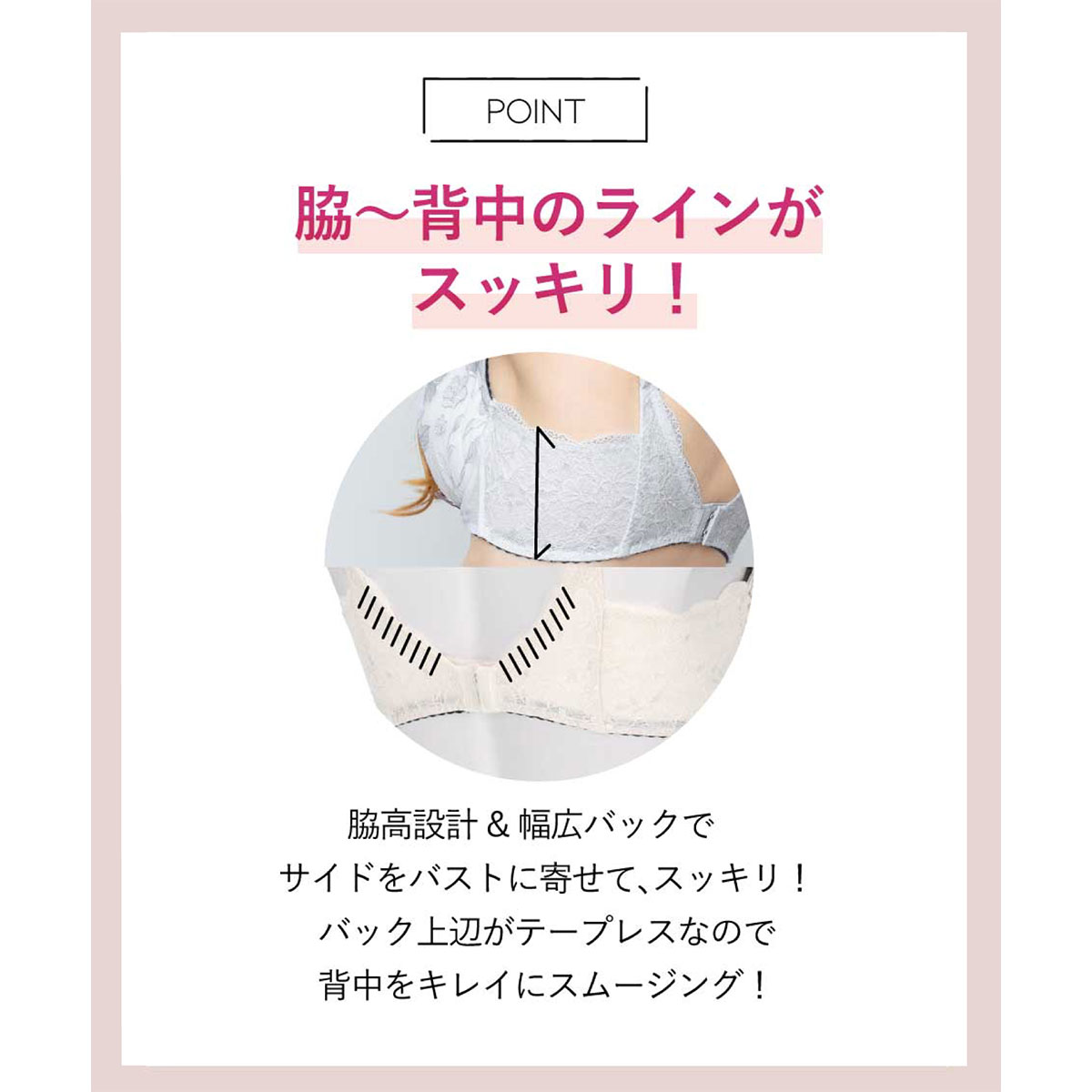 脇高設計&幅広のバックで、はみ出た脇肉・サイドをバストに寄せて、スッキリ。上辺にテープを使っていないテープレスのバックで、脇の段差を軽減し、背中をきれいにスムージング。