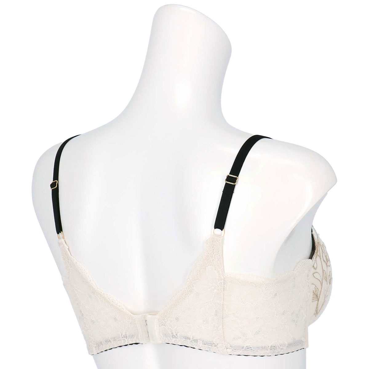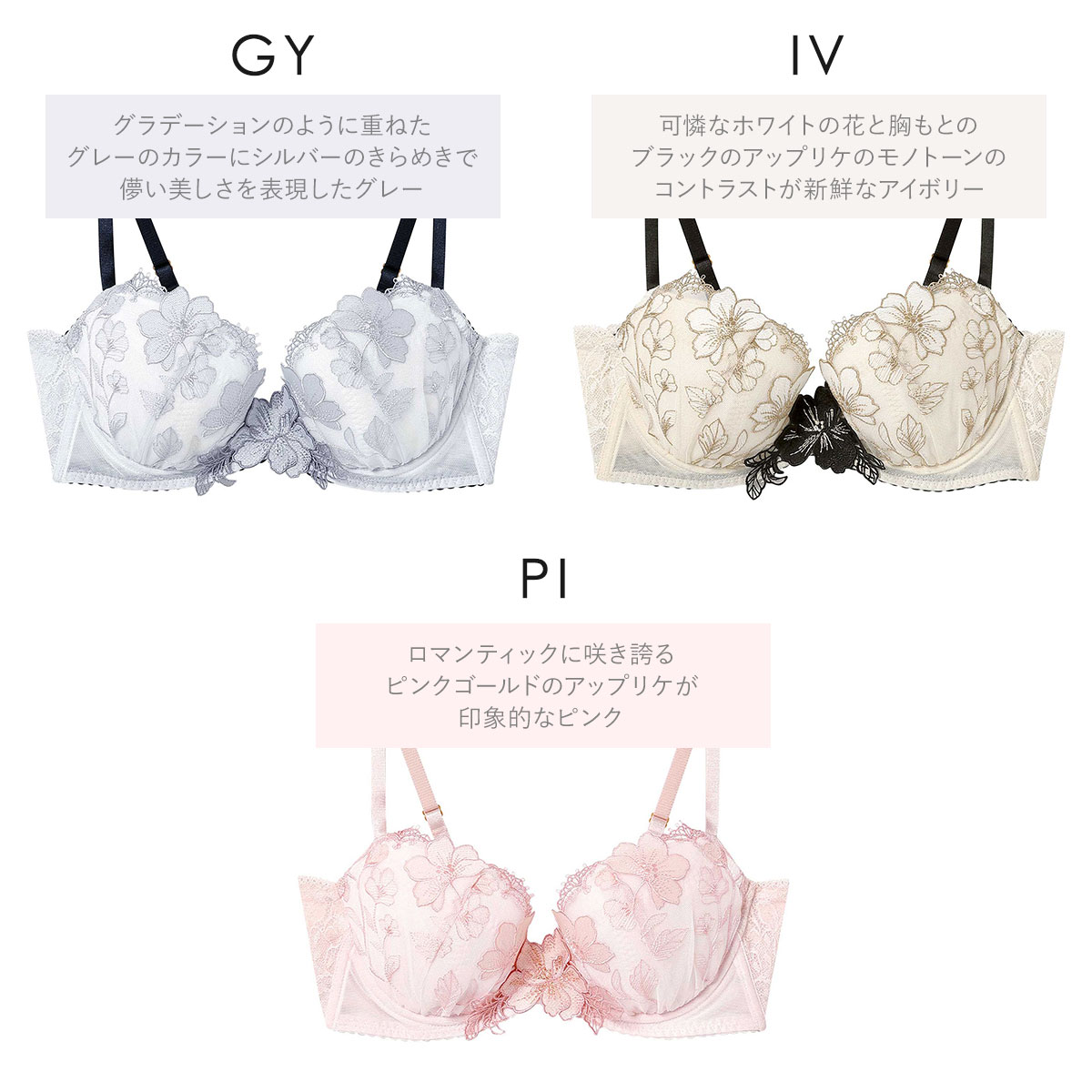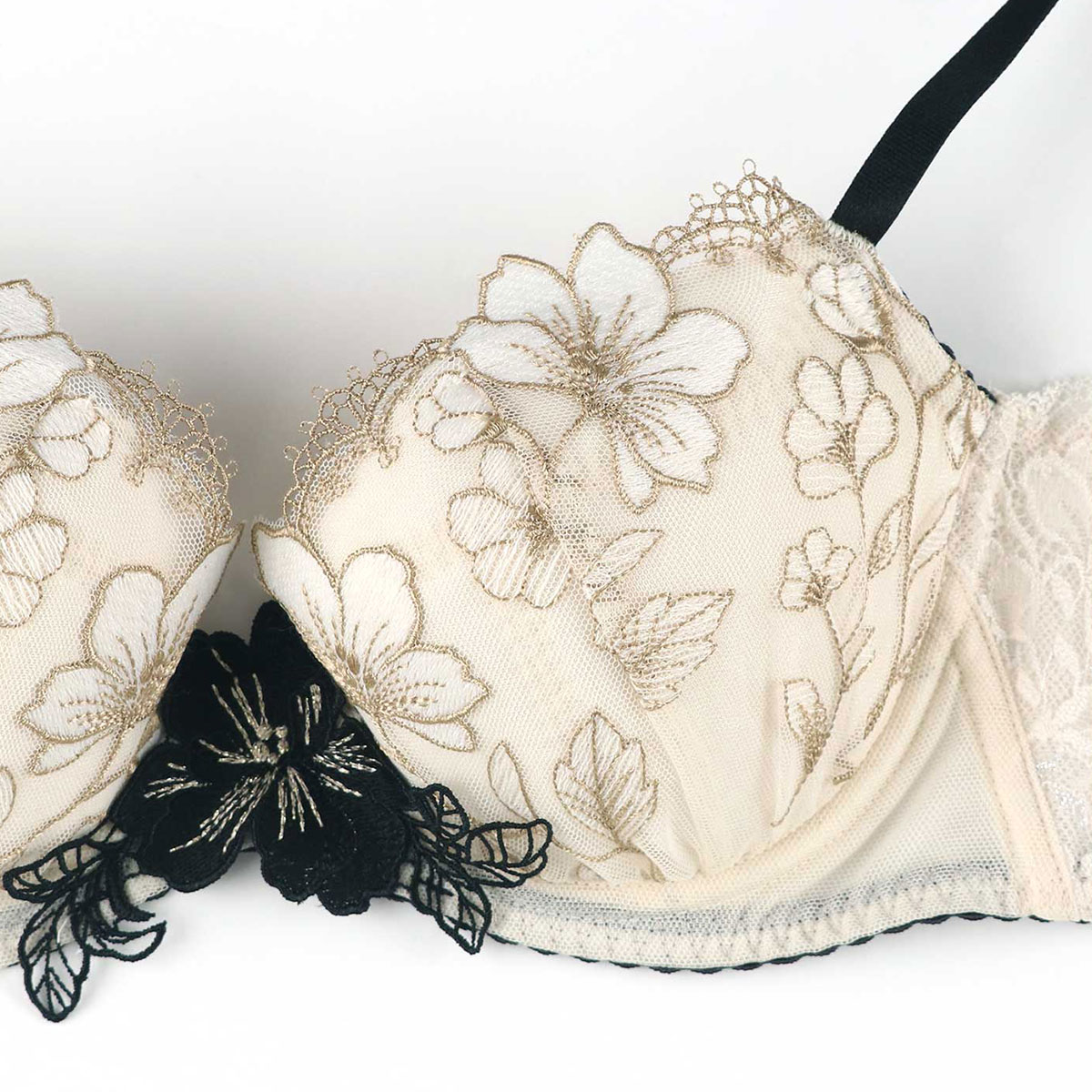 可憐な花のモチーフをウーリー糸の刺繍糸で優しく表現し、上品で繊細な印象のエンブロイダリーレースで仕上げました。前中心に咲き誇る、花のブローチに見立てたケミカルアップリケがポイントです。カップはワンダーツに少しギャザーを加えて、レースの軽さを感じられます。