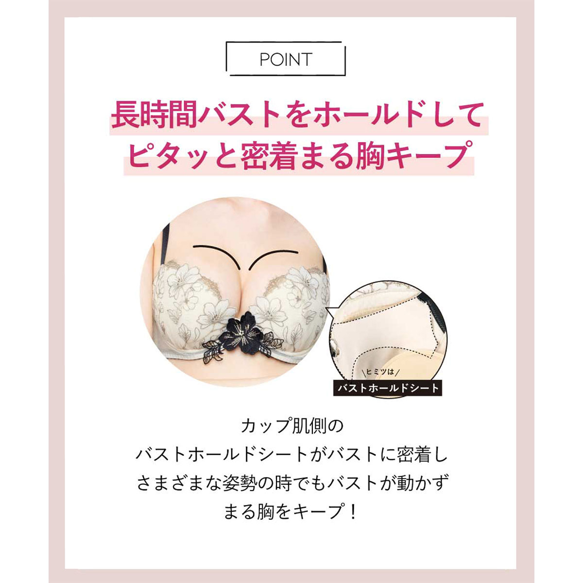 カップ肌側のシートがバストに密着し、さまざまな姿勢の時でもバストが動かずまる胸をキープ。