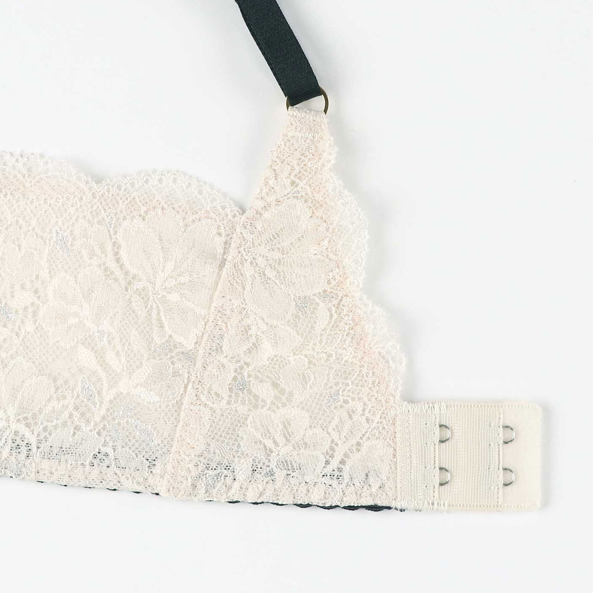バック部分に使用しているラッセルレースにもきらめく繊細なラメ糸を使用し、さりげない上品さをそえています。バックはひびきにくいストレッチレースを使用したスムージングタイプで、背中まで美しく見えるようなデザイン。