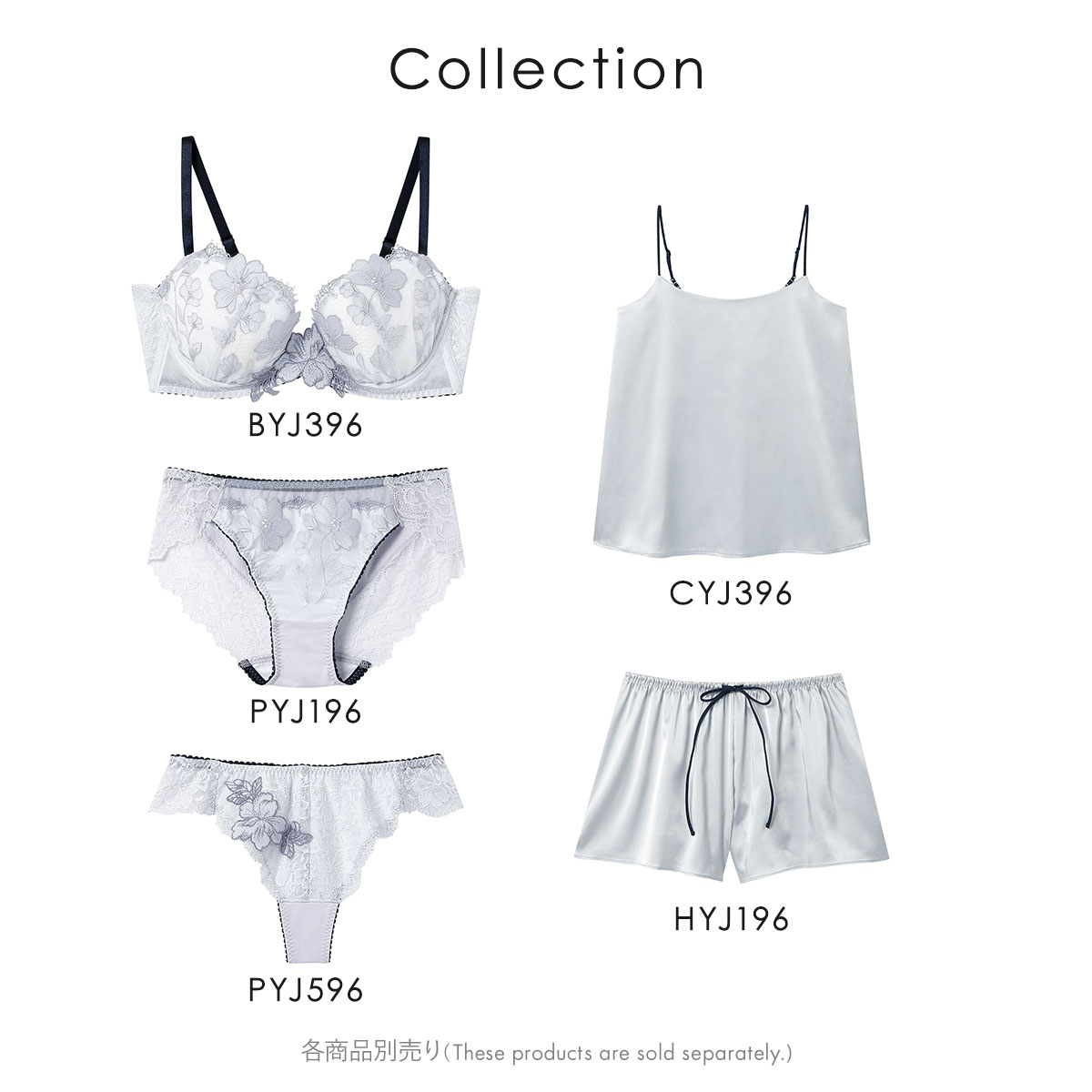 可憐な花のモチーフをウーリー糸の刺繍糸で優しく表現し、上品で繊細な印象のエンブロイダリーレースで仕上げました。前中心に咲き誇る、花のブローチに見立てたケミカルアップリケがポイントです。カップはワンダーツに少しギャザーを加えて、レースの軽さを感じられます。