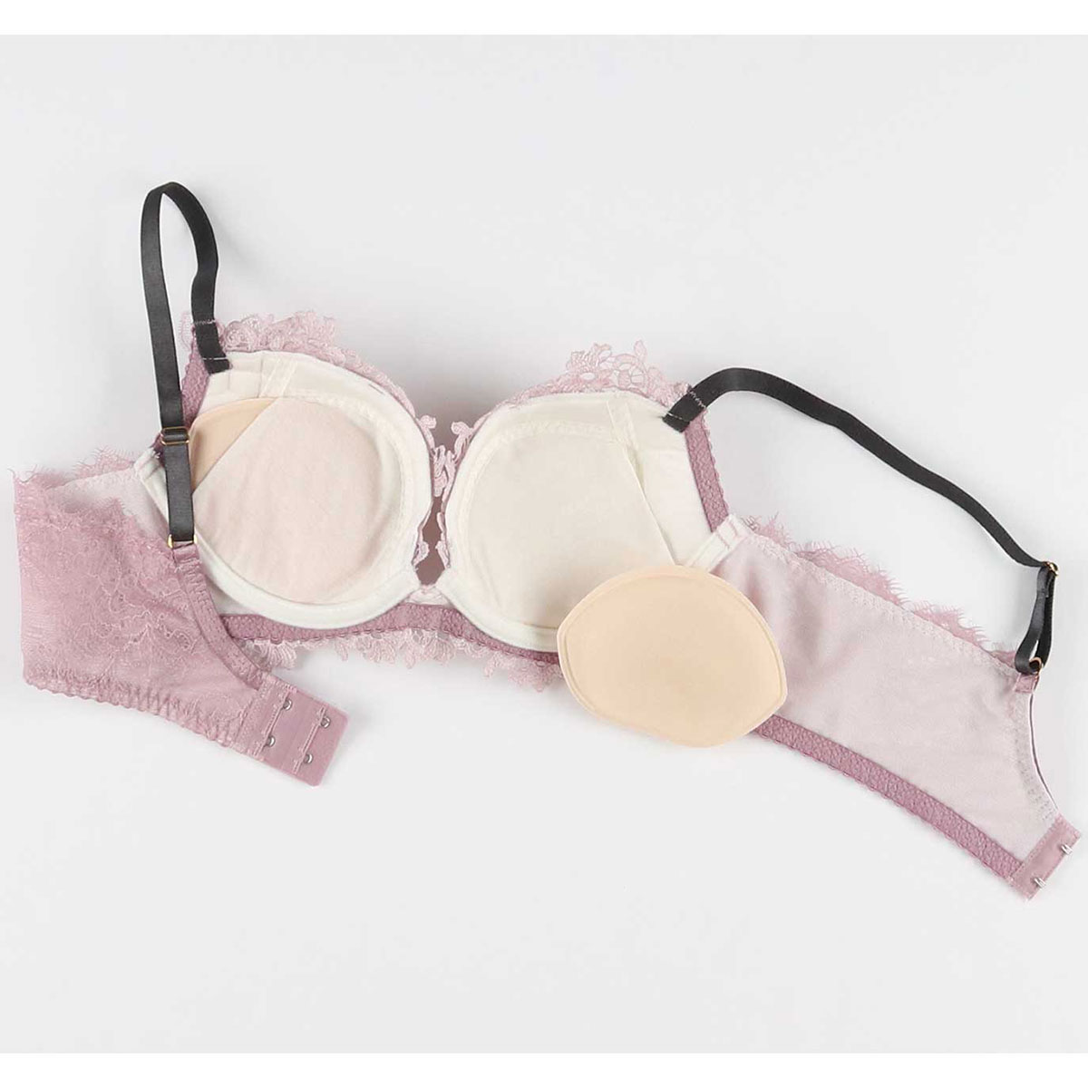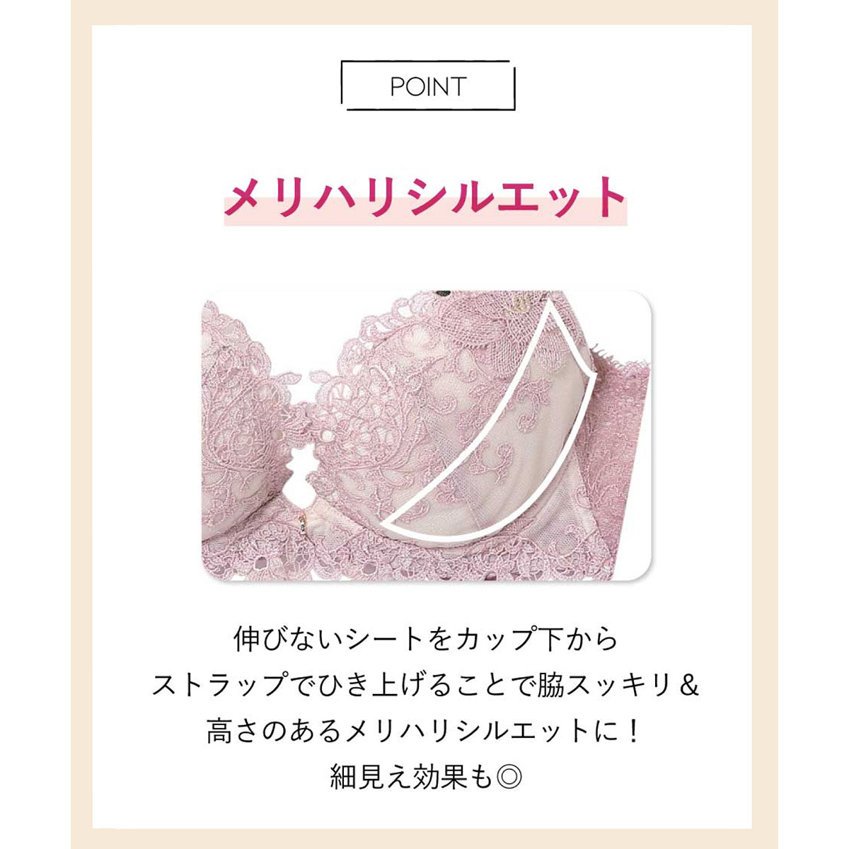 カップ脇に使用している伸びないシートが、バストサイドスッキリ&寄せたバストをコンパクトにキープして細見え効果も。前中心が低いワイヤーを使用しているので、脇からしっかり寄せたバストに谷間をメイク。さらにワイヤーが当たりにくく、軽いつけごこちです。