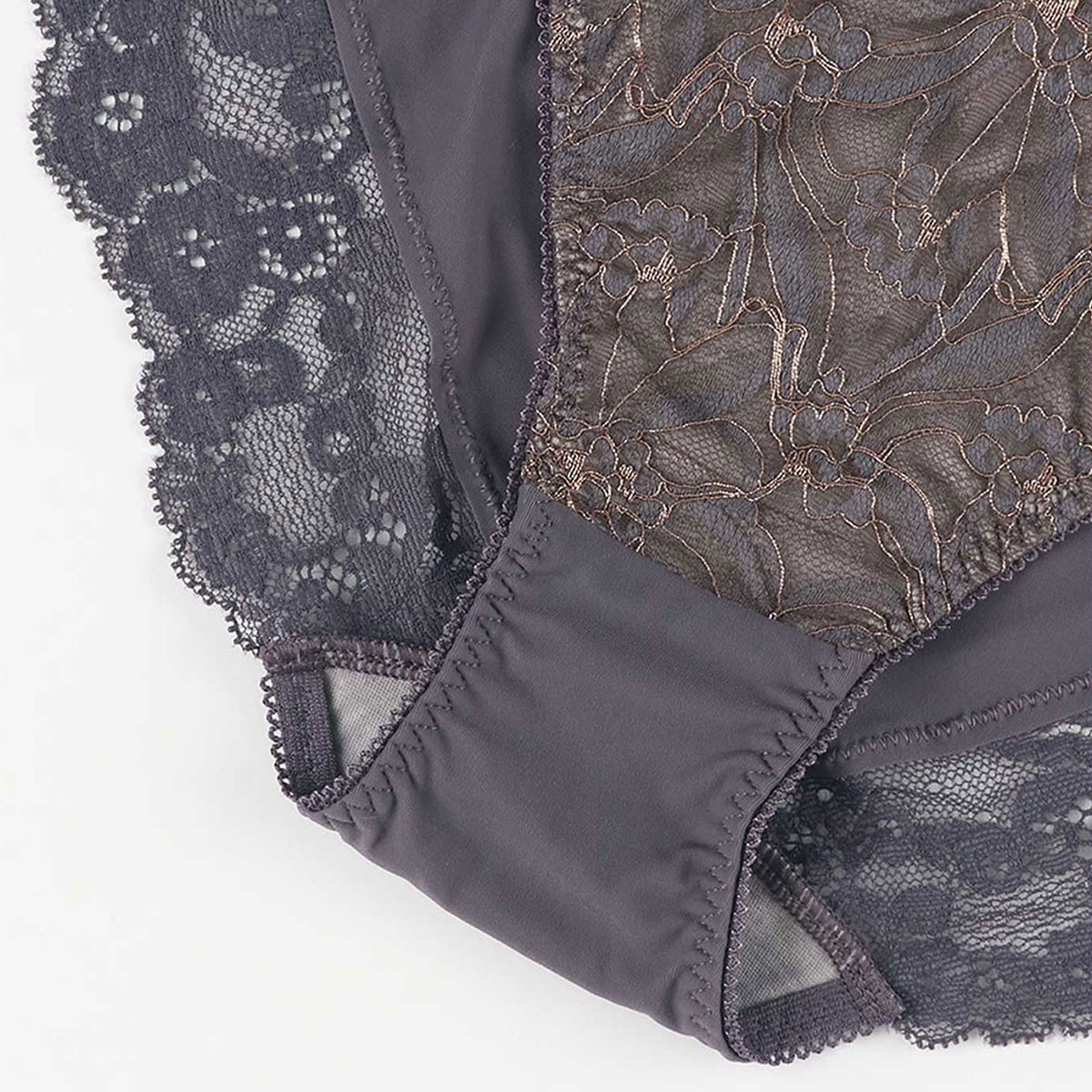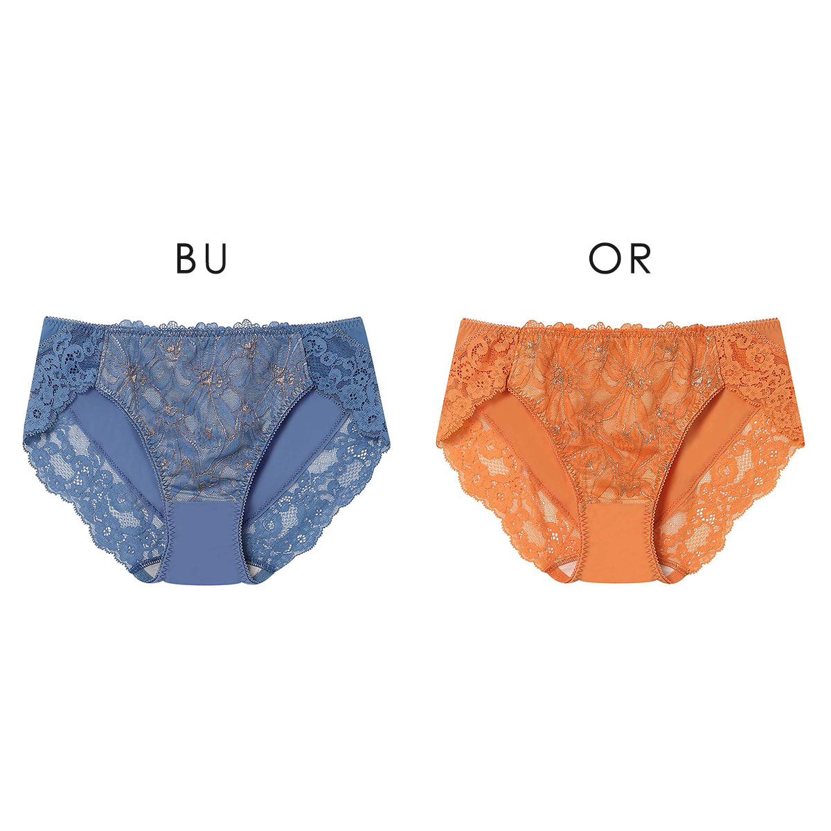 フロントに華やかなレースをあしらったショーツ。後ろ身頃は吸汗速乾の伸びの良い素材を使用し、さらっと快適な履きごこち。裾にはストレッチレースを使用しアウターにひびきにくいデザインです。