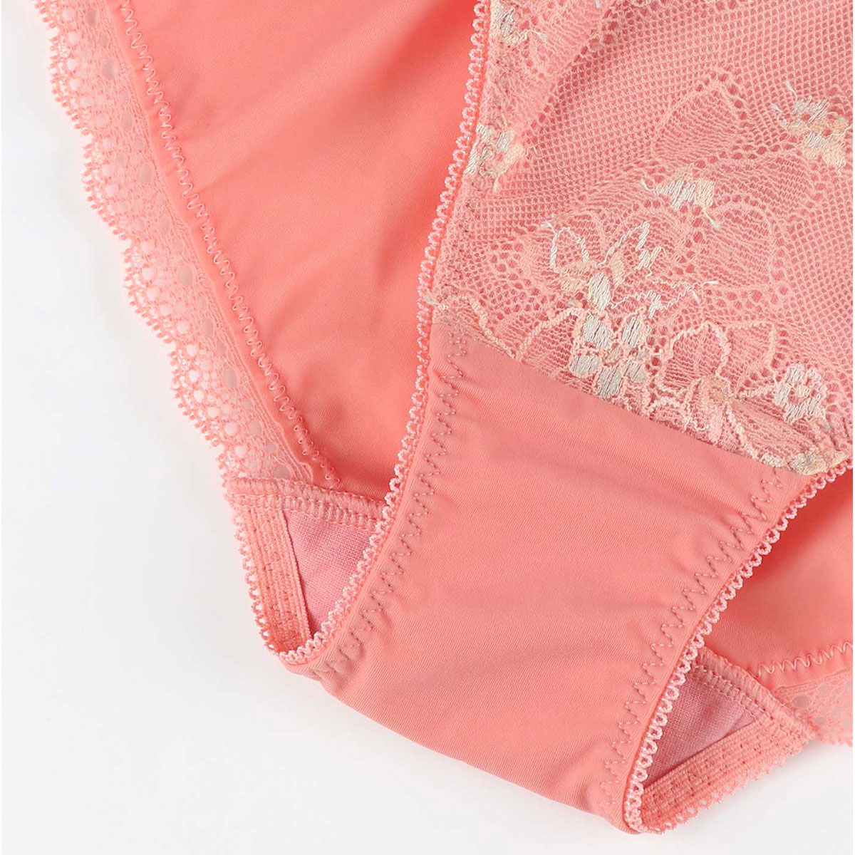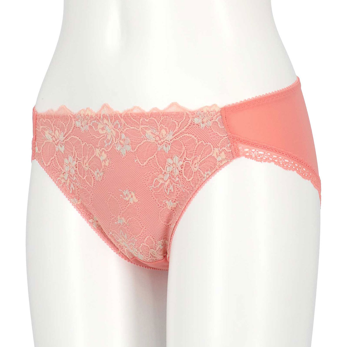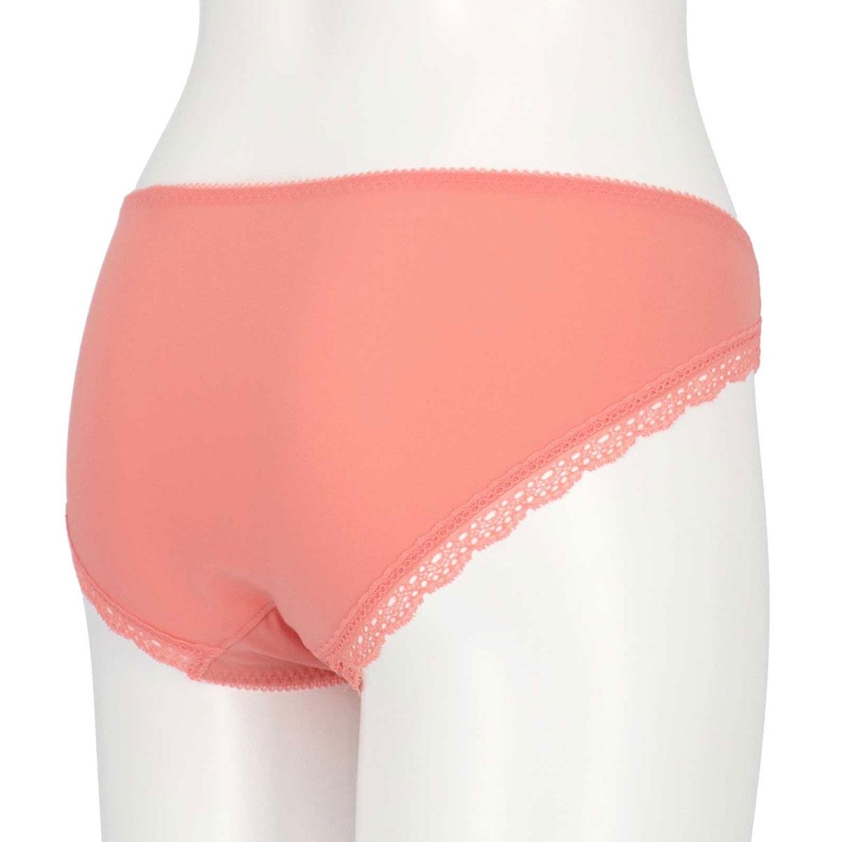 前ウエストにレースをストレートに配したデザインのショーツ。後ろ身頃は吸汗速乾の伸びの良い素材を使用し、裾にはストレッチレースを使用しアウターにひびきにくいデザインです。
