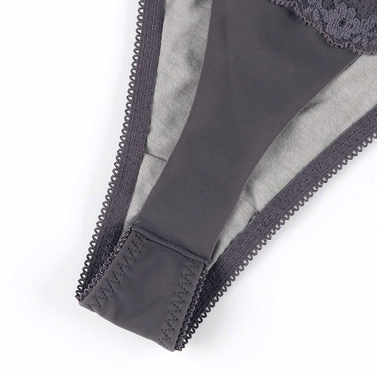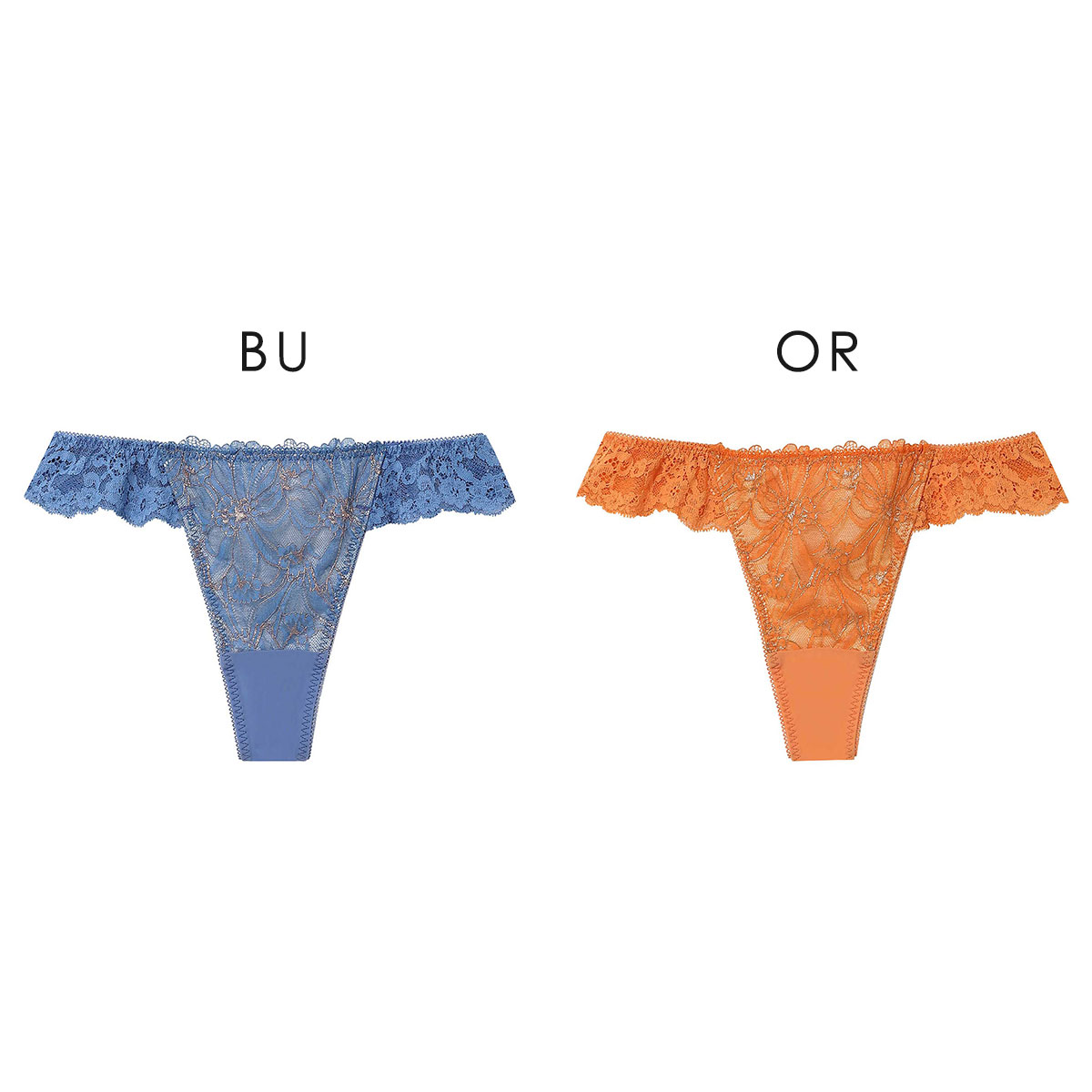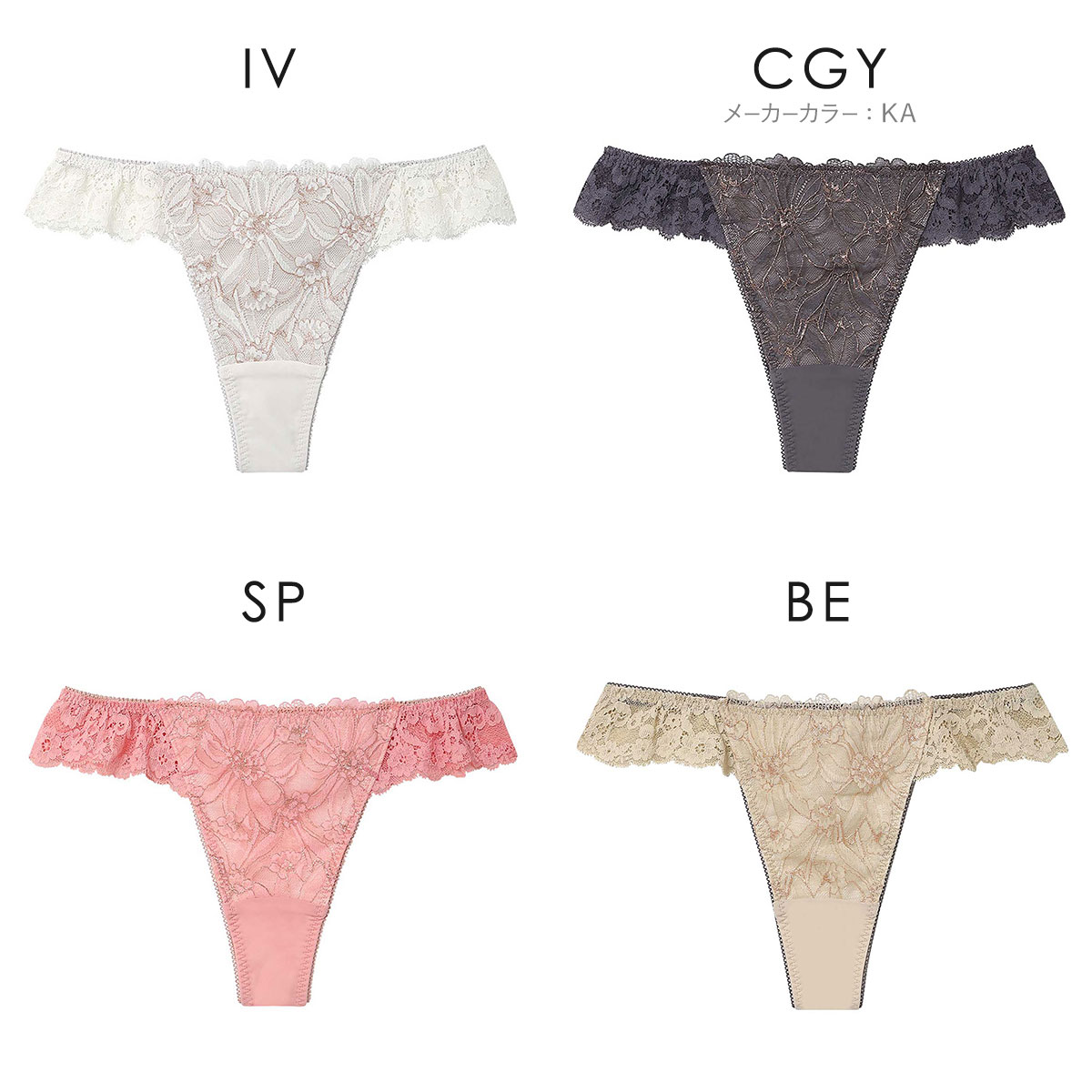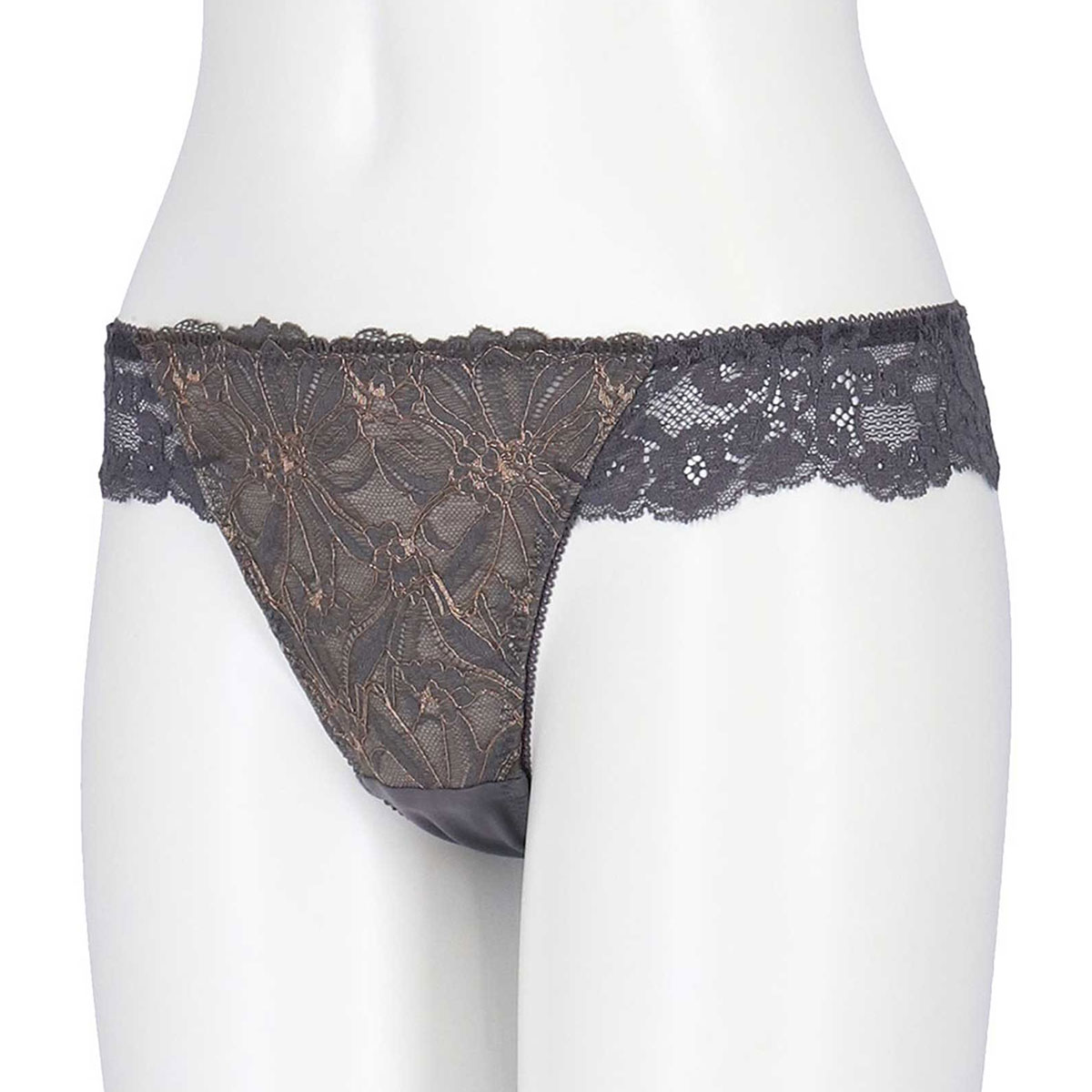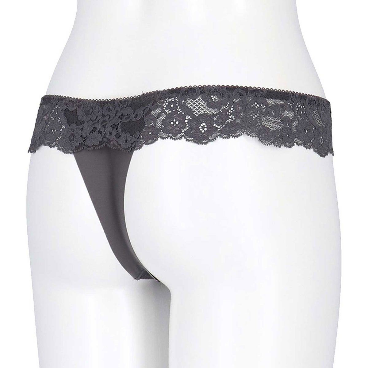 フロントにレースをあしらい、ウエストをストレッチレースで飾った華やかなデザインのソング。バックはフリーなカッティングで、軽いはきごこちです。