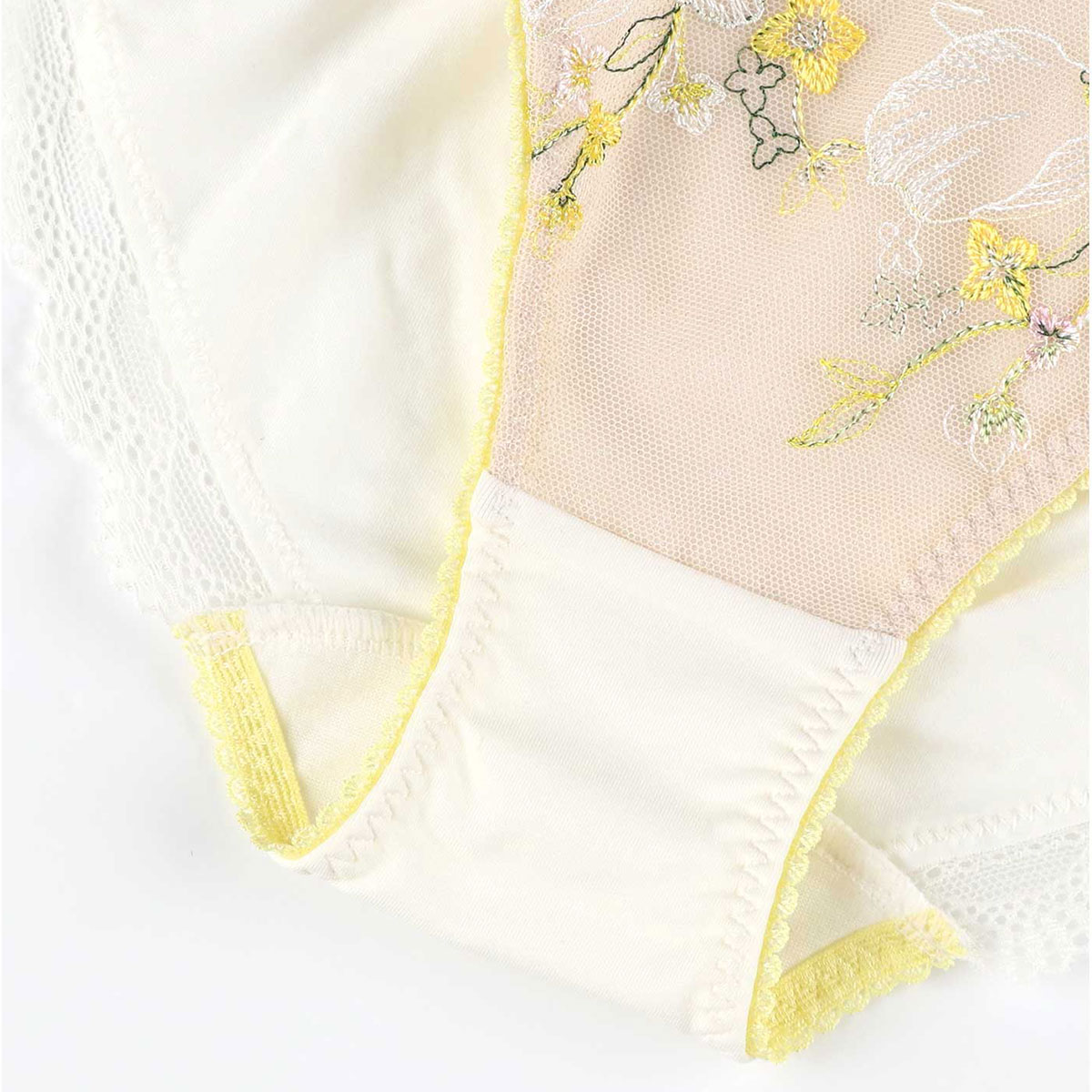 フロントにエンブロイダリーレースをあしらい、上辺はチュールで抜け感をプラスした軽やかなショーツ。