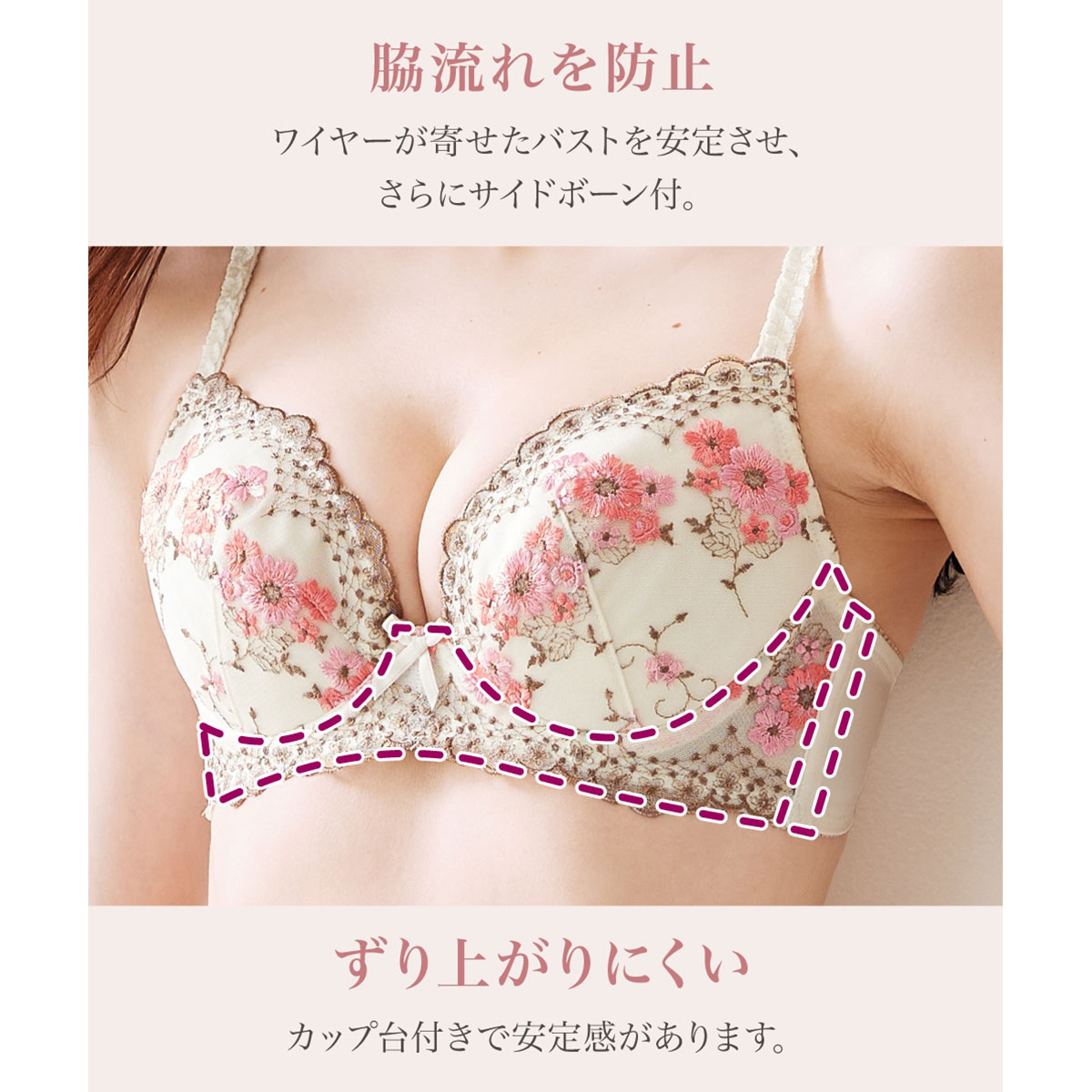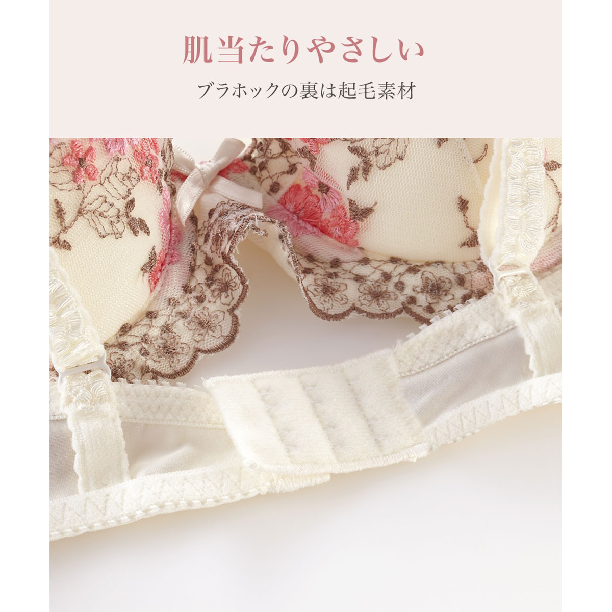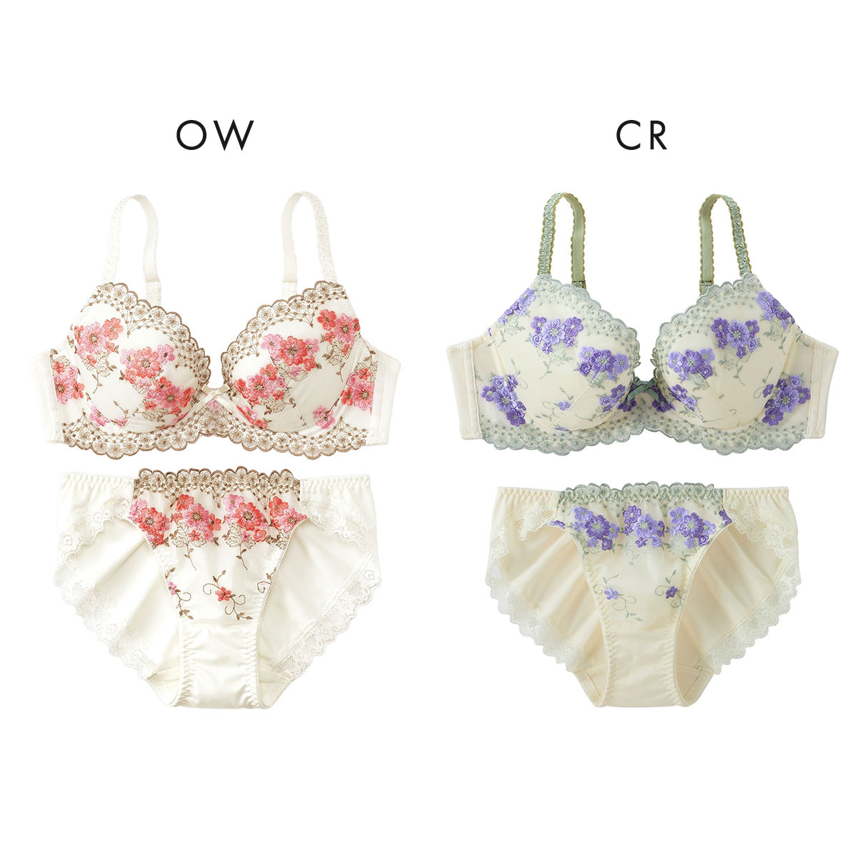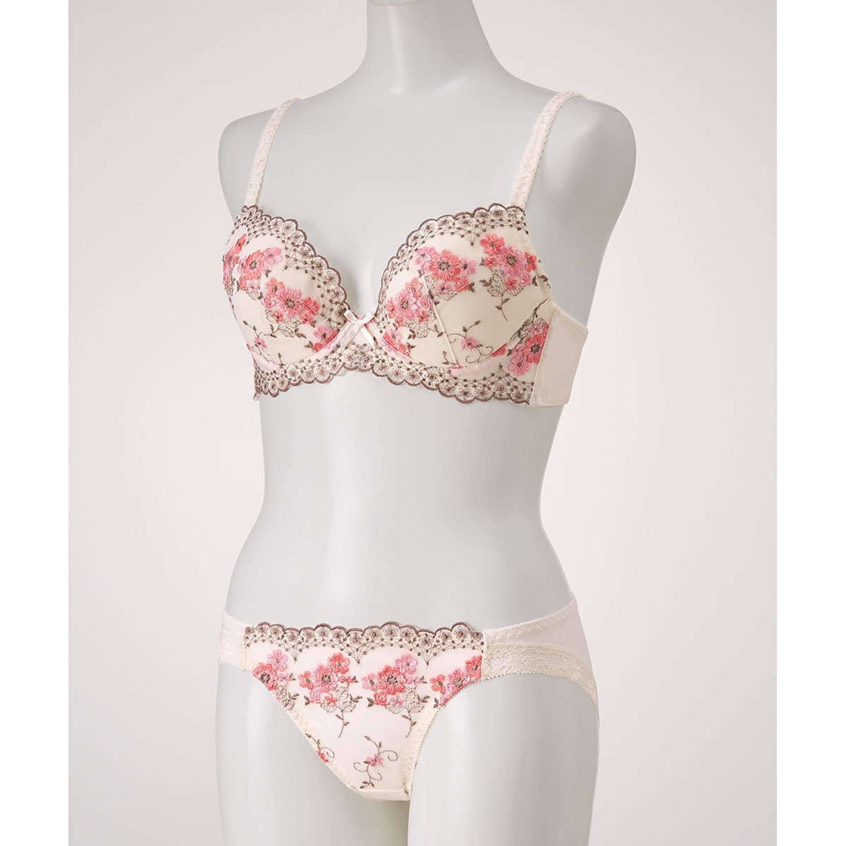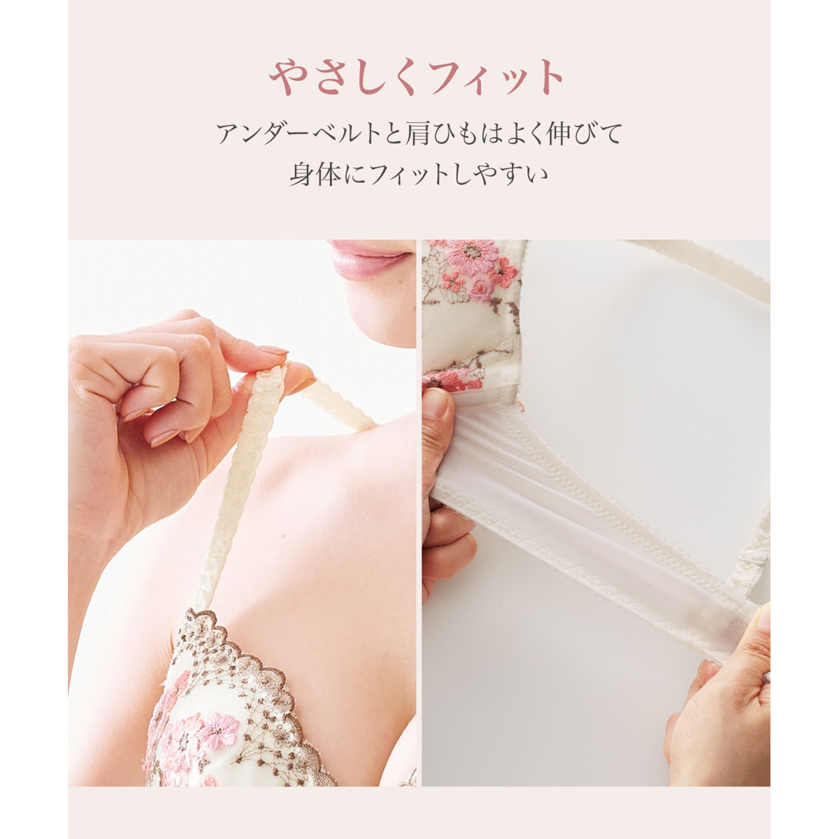 ニッセンとトリンプの共同企画による、大人気のブラジャー・ショーツセットです。可愛らしい小花柄の刺しゅうが、気分を上げてくれます。