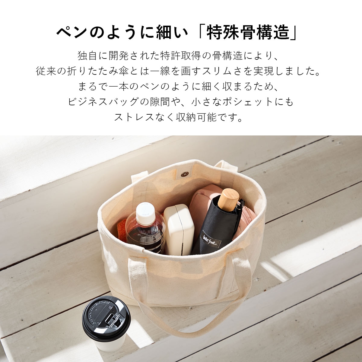 独自に開発された特許取得の骨構造により、従来の折りたたみ傘とは一線を画すスリムさを実現しました。まるで一本のペンのように細く収まるため、ビジネスバッグの隙間や、小さなポシェットにもストレスなく収納可能です。