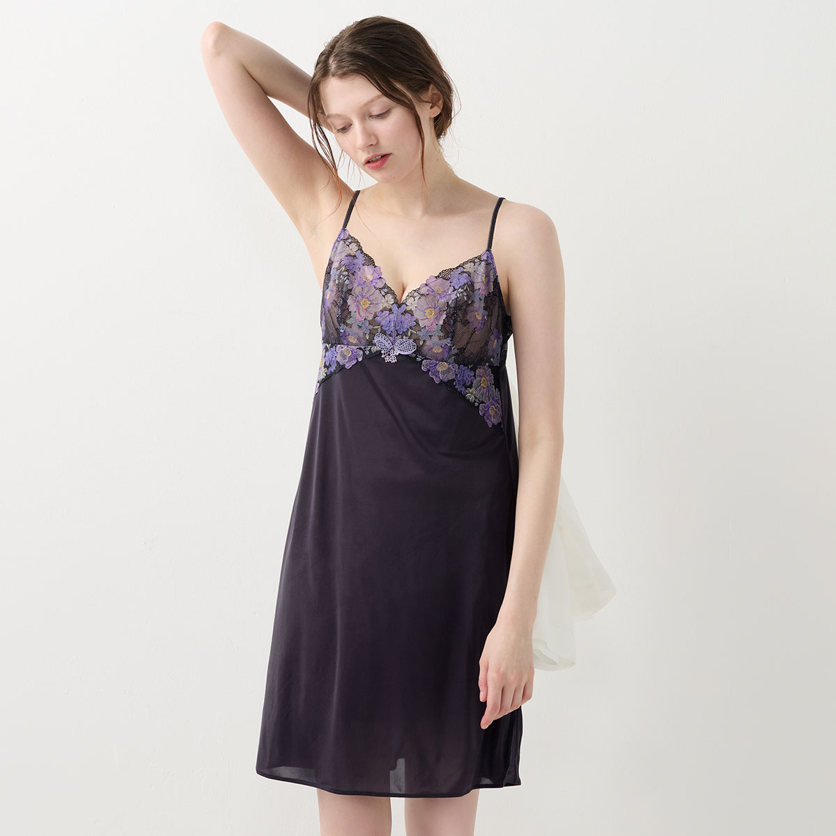 バスト部分にたっぷりとレースをあしらった豪華なデザインが、デコルテを華やかに彩ります。身生地にはなめらかで柔らかなスムース素材を使用し、肌に吸い付くような優しく快適な着心地を叶えました。