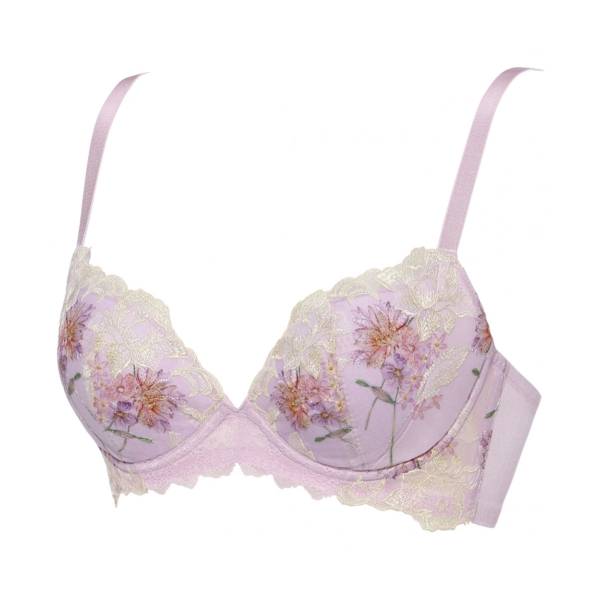 クレマチスや満開のバラ、ジャスミンをイメージした繊細なレースに、光り輝くラメ糸とみずみずしいプリントを施した、トリンプ プレミアムラインのブラジャーです。
